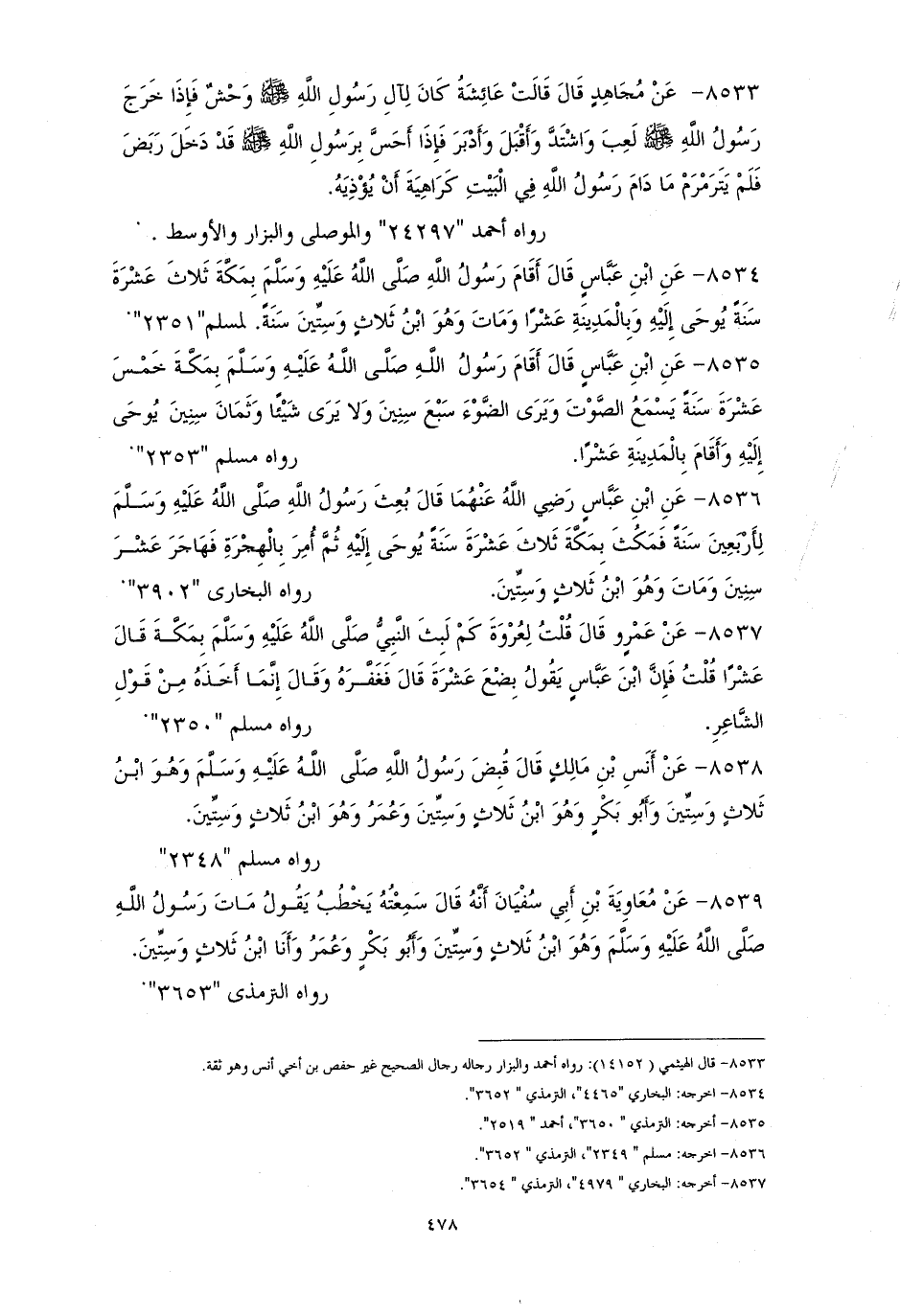 8538 - أنسُ: تُوفيَّ النبيُّ - صلى الله عليه وسلم - وهو ابنُ ثلاثٍ وستين سنةً، وأبو بكرٍ وهو ابنُ ثلاثٍ وستينَ، وعمر وهو ابن ثلاثٍ وستينَ. لمسلم (¬1).