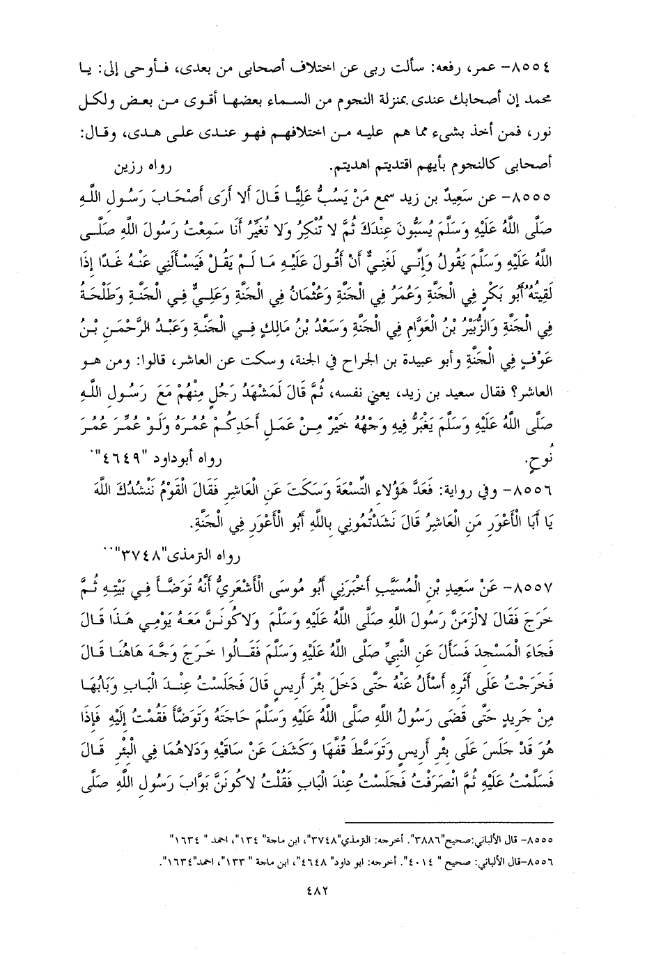 8554 - عمر: رفعه: ((سألتُ ربي عن اختلاف أصحابي من بعدي، فأوحى إليَّ يا محمدُ أنَّ أصحابك عندي بمنزلةِ النجوم من السماءِ بعضُها أقوى من بعضٍ، ولكلٍّ نورٌ، فمن أخذ بشيءٍ مما هم عليه من اختلافهم؛ فهو عندي على هدى))، وقال: ((أصحابي كالنجوم بأيهمُ اقتديتُم اهديتم)). لرزين.