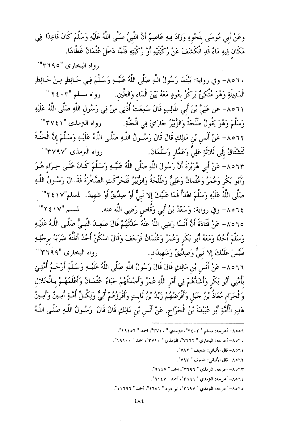 8562 - أنس رفعه: ((إنَّ الجنةَ تشتاقُ إلى ثلاثةٍ: عليٌّ وعمار وسلمان)). هما للترمذي (¬1).