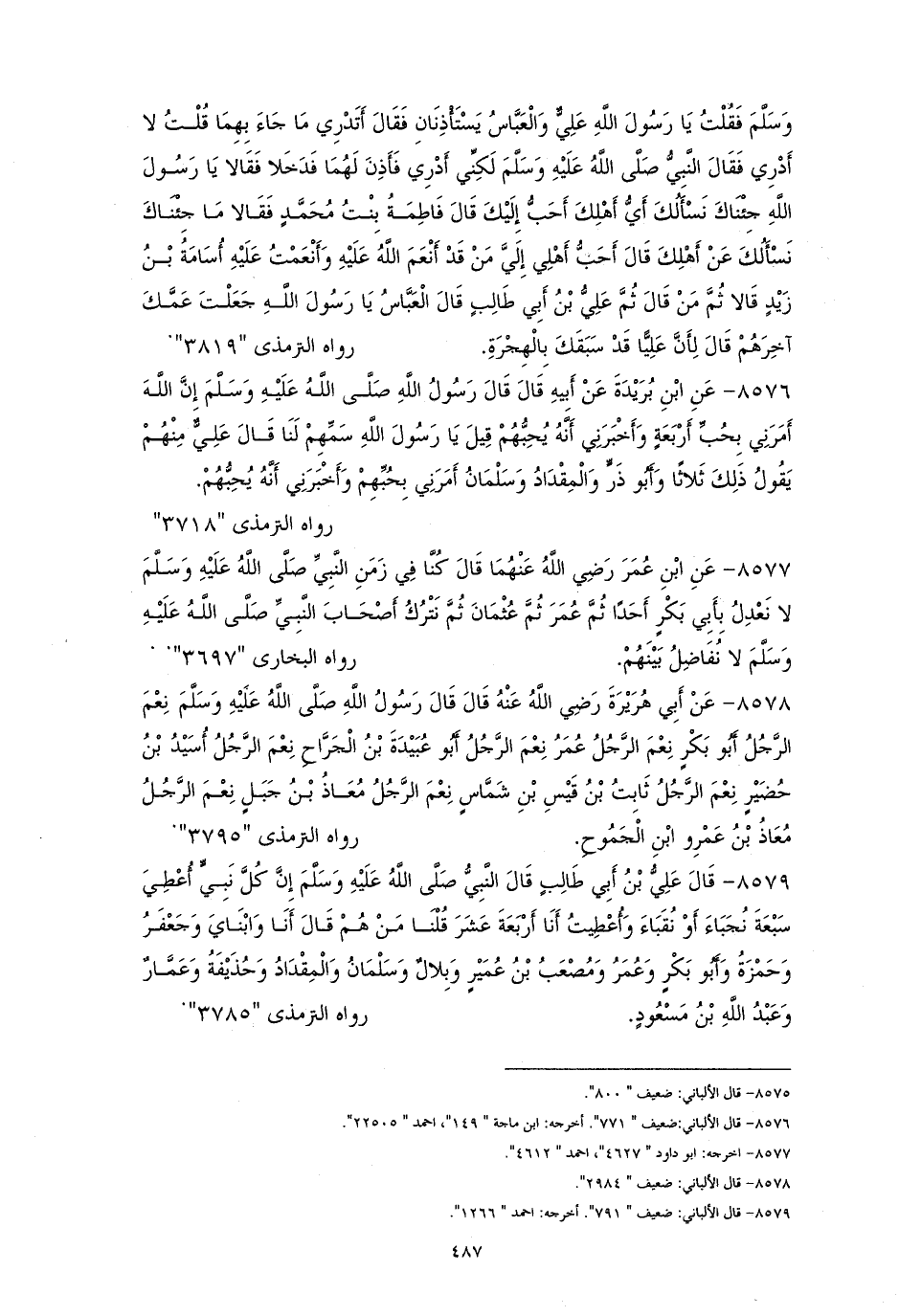 8576 - بريدة: رفعه: ((إنَّ الله تعالى أمرني بحبِّ أربعةٍ، وأخبرني أنَّه يحبهم))، قيل: يا رسول الله سمِّهم، قال: ((عليُّ منهم، يقولُ ذلك ثلاثًا، وأبو ذرٍ والمقدادُ وسلمانُ أمرني بحبهم وأخبرني أنه يُحبُّهم)). هما للترمذي (¬1).