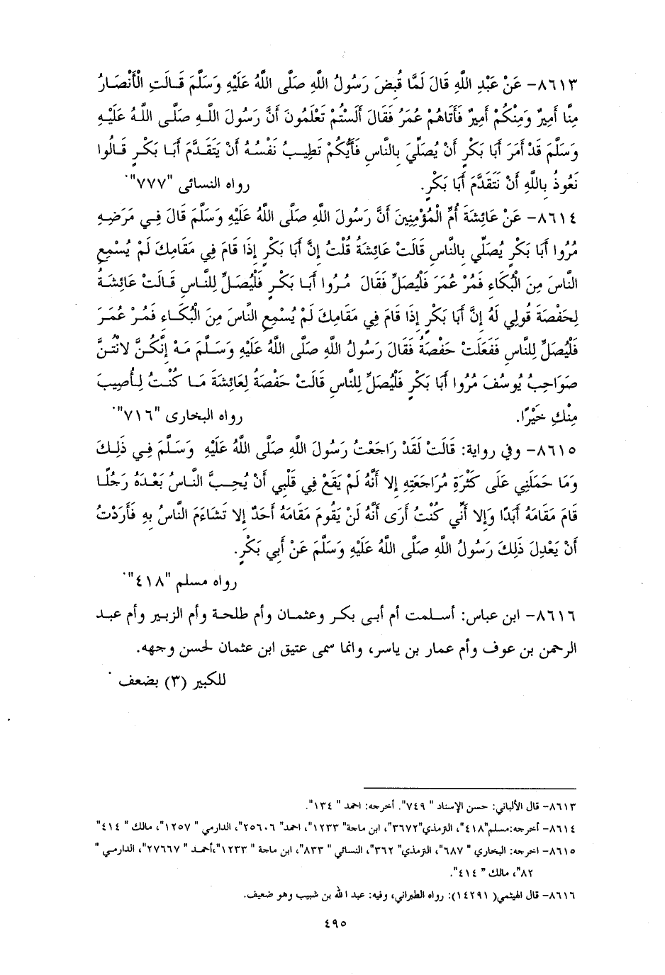 8613 - ابنُ مسعود: لما قُبض النبيُّ - صلى الله عليه وسلم - قالت الأنصارُ: منا أميرٌ ومنكم أميرٌ، فأتاهم عمرُ فقال: ألستم تعلمون أنَّ النبيَّ - صلى الله عليه وسلم - أمر أبا بكر أن يصليَّ بالناسِ؟ فأيكم تطيبُ نفسهُ أن يتقدمَ أبا بكرٍ؟ قالوا: نعوذُ بالله أن نتقدم أبا بكر. للنسائي (¬1).