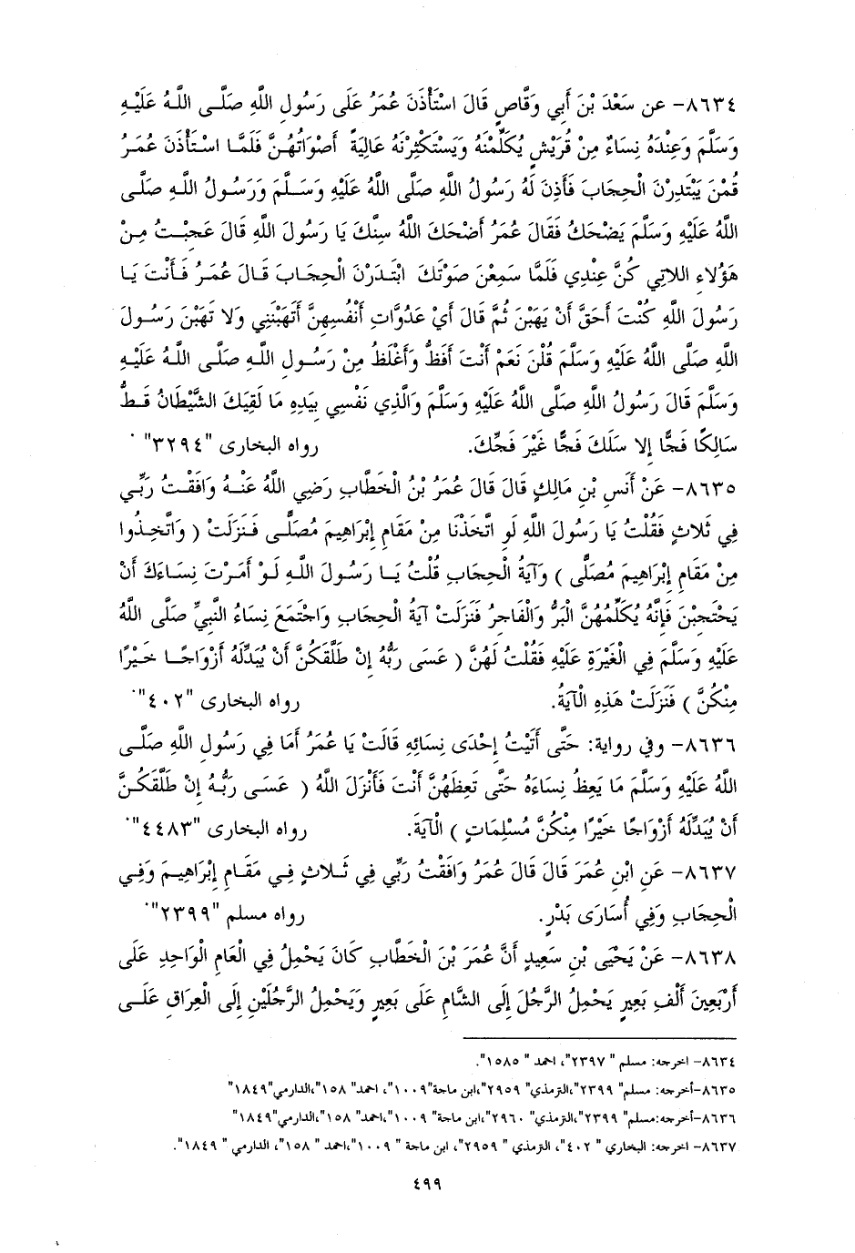 8637 - وفي أخرى: وافقتُ ربي في ثلاثٍ: في مقامِ إبراهيم، وفي الحجابِ، وفي أسارى بدرٍ. هما للشيخين (¬1).