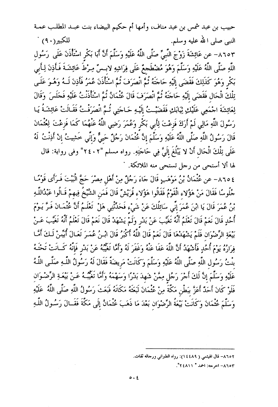 8653 - عائشة: استأذن أبو بكرٍ على النبيِّ - صلى الله عليه وسلم - وهو مضطجعٌ على فراشي عليه مرطٌ لي، فأذن له، وهو على حالهِ، فقضى إليه حاجته، ثمَّ انصرف، ثم استأذنَ عمرُ فأذنَ له وهو على تلك الحالةِ، فقضى إليه حاجتهَ ثم انصرفَ، ثم استأذنَ عثمانُ فجلسَ - صلى الله عليه وسلم - وأصلحَ عليه ثيابه وقال: ((اجمعي عليك ثيابك))، فأذن له، فقضى إليه حاجته ثم انصرفَ، فقلتُ: يا رسولَ الله! لم أرك فزعت لأبي بكرٍ وعمرَ كما فزعت لعثمانَ؟ فقال: ((يا عائشةُ! إنَّ عثمانَ رجلٌ حييٌ، وإني خشيتُ إن أذنتُ له على تلك الحالةِ أن لا يبلغ إليَّ حاجتَه)). وفي رواية: قال لها: ((ألا استحيي من رجلٍ تستحيى منه الملائكةُ)). لمسلم (¬1).