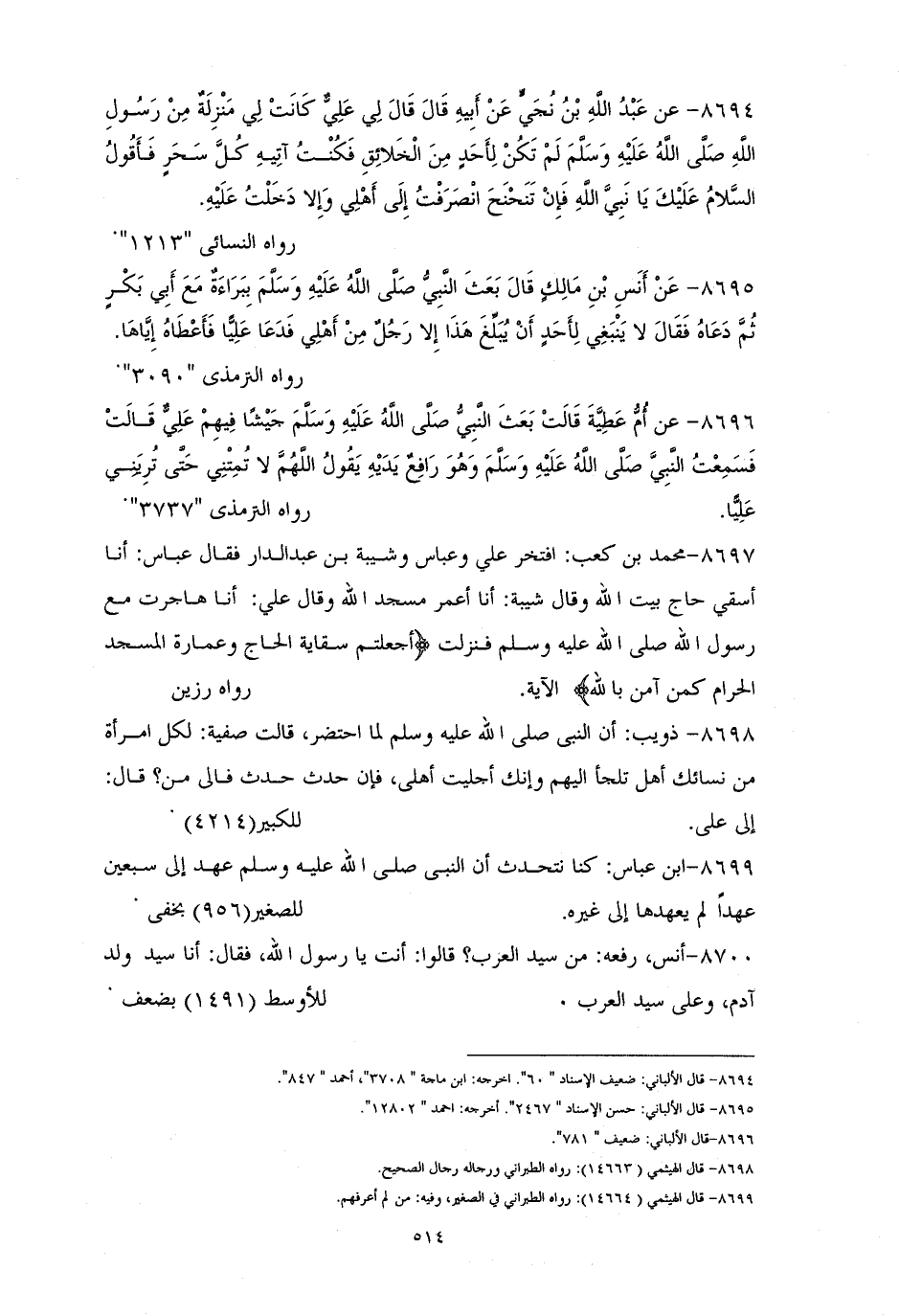 8700 - أنس رفعه: ((من سيدُ العربِ؟)) قالوا: أنتَ يا رسولَ الله، فقال: ((أنا سيدُ ولدِ آدمَ، وعليٌّ سيدُ العربِ)). للأوسط بضعف (¬1).