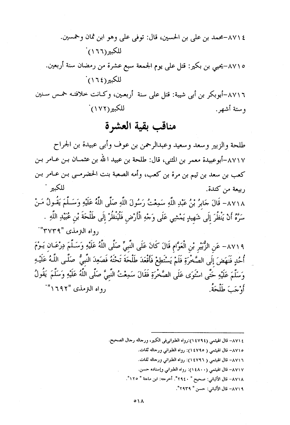 8718 - جابر رفعه: ((من سرَّهُ أن ينظر إلى شهيدٍ يمشى على وجهِ الأرضِ فلينظر إلى طلحةَ بن عبيدِ الله)) (¬1).