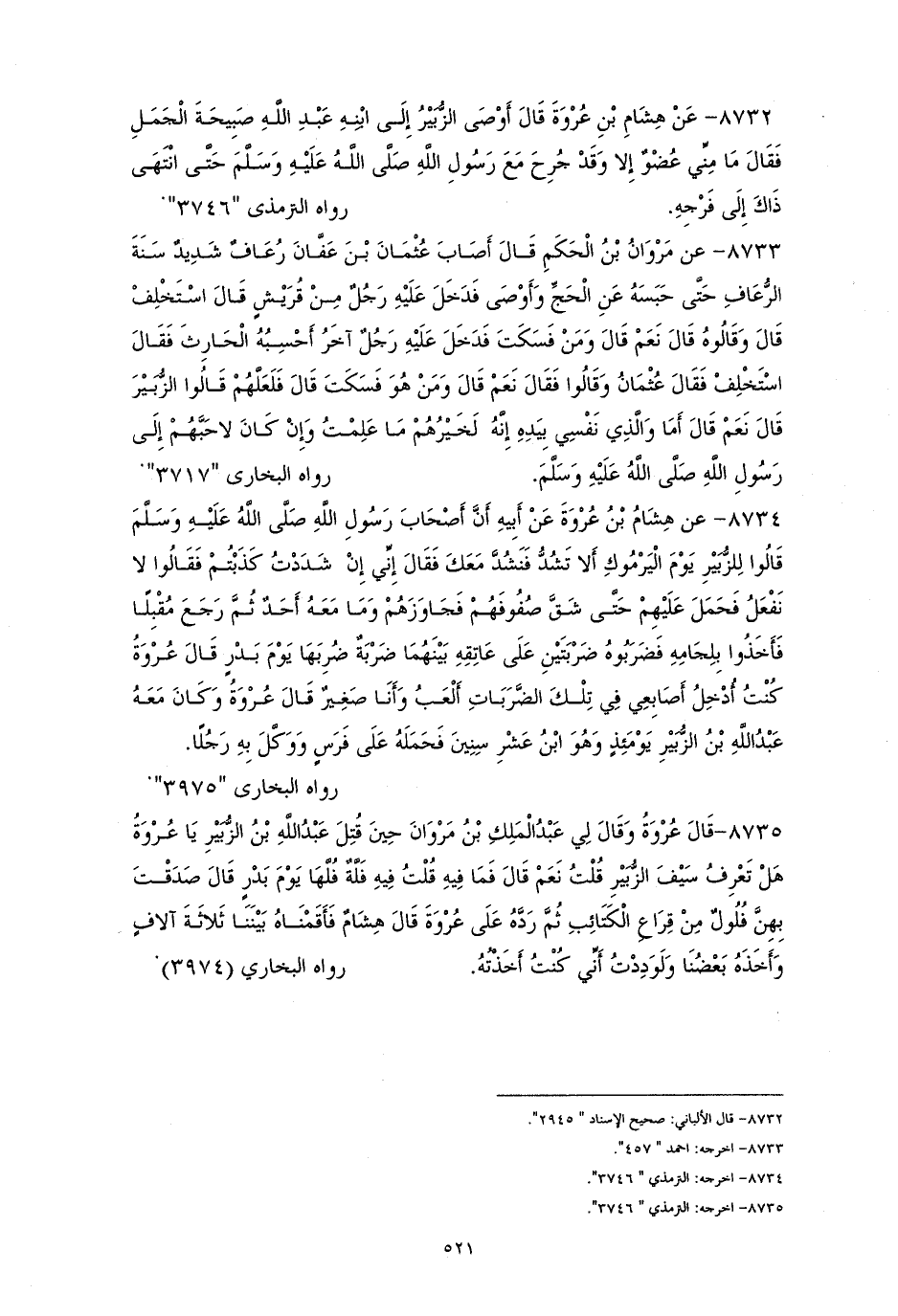 8735 - وعنه: قالَ لي عبدُ الملكِ بنُ مروانَ حين قُتلَ عبدُ الله: يا عروةُ هل تعرفُ سيفَ الزبيرِ؟. قلتُ: نعم، قال: فما فيه؟ قلتُ: فيه فلةٌ فلَّها يومَ بدرٍ، وقال: صدقتَ بهنَّ فلولٌ من قراعِ الكتائبِ، ثمَّ ردَّهُ على عروةَ قال هشامٌ: فأقمناه بثلاثةِ آلافٍ فأخذهُ بعضُنا، ووددتُ أنِّي كنتُ أخذتُه وكان على بعضهِ. هي للبخاري (¬1).