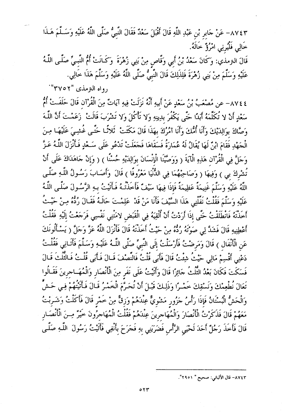 8744 - سعد: أُنزلت فيَّ أربعُ آياتٍ من القرآنِ حلفت أمُّ سعدٍ أن لا تكلِّمهُ أبدًا حتَّى يكفرَ بدينهِ، ولا تأكلُ ولا تشربُ، قالت: زعمتَ إنَّ الله وصاكَ بوالديك وأنا أمُّك وأنا آمرك بهذا، فمكثتْ ثلاثًا حتَّى غشى عليها من الجهد، فقام ابنٌ لها يُقالُ له عمارةُ، فسقاها، فجعلت تدعُو على سعدٍ فنزلَ {وَوَصَّيْنَا الْأِنْسَانَ بِوَالِدَيْهِ حُسْناً وَإِنْ جَاهَدَاكَ لِتُشْرِكَ بِي مَا لَيْسَ لَكَ بِهِ عِلْمٌ فَلا تُطِعْهُمَا} إلى {معروفًا} [العنكبوت: 8] قالَ: وأصابَ النبيُّ - صلى الله عليه وسلم - غنيمةً عظيمةً فإذا فيه سيفٌ، فأخذتُه فأتيتُ به النبيَّ - صلى الله عليه وسلم -، فقلتُ نفلني هذا السيفُ، فأنا من قد علمت حالهُ، فقال: ((ردَّهُ حيثُ أخذتهُ)) فانطلقتُ حتَّى أردتُ أن ألقيهُ في القبضِ لا متني نفسي فرجعتُ إليهِ، فقلتُ أعطنيهِ، فشدَّ لي صوتهُ: ((ردَّهُ من حيثُ أخذتهُ)) فنزل {يَسْأَلونَكَ عَنِ الْأَنْفَال} [الأنفال: 1] ومرضتُ فأرسلتُ إليه - صلى الله عليه وسلم - فأتاني. فقلتُ: دعنى أقسِّمُ مالي حيثُ شئتُ، فأبى، قلتُ فالنصفُ، فأبى، قلتُ فالثلثُ، فسكت، فكان بعد الثلثِ جائزًا، وأتيت على نفرٍ من الأنصارِ والمهاجرينَ فقالوا: تعالَ نطعُمك ونسقيكَ خمرًا، وذلك قبل أن تحرَّم، فأتيتُهم فإذا رأسُ جزورٍ مشوىٍّ وزقِ خمرٍ عندهُم، فأكلتُ وشربتُ، فذكرت الأنصارُ والمهاجرون عندهُم، فقلتُ: المهاجرون خيرٌ من الأنصارِ، فأخذَ رجلٌ أحد لحي الرأسِ فضربني بهِ فجرحَ أنفي، فأتيتُهُ - صلى