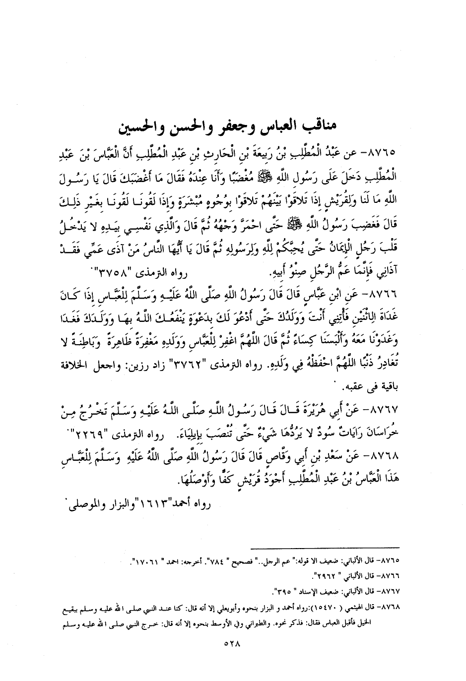 8765 - عبد المطلب بن ربيعة: أنَّ العباسَ دخل على النبيِّ - صلى الله عليه وسلم - مُغضبًا فقال له: ((ما أغضبكَ؟)) فقال: يا رسولَ الله، أرى قومًا من قريشٍ يتلاقون بينهم بوجوهٍ مسفرةٍ، وإذا لقونا لقونا بغير ذلك. فغضب - صلى الله عليه وسلم - حتَّى احمرَّ وجههُ، وقال: (والذي نفسي بيده لا يدخلُ قلبَ رجلٍ إيمانٌ حتَّى يحبُكُم للهِ ورسولِهِ)). ثُمَّ قالَ: ((أيُّها النَّاسُ، من آذى عمِّى فقد آذاني، وإنَّما عمُّ الرجلِ صنوُ أبيه)) (¬1).