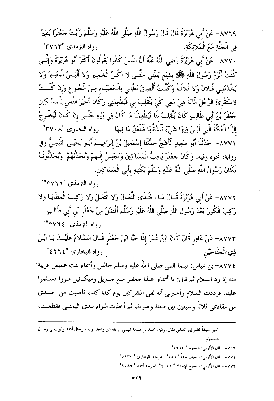 8769 - أبو هريرة رفعهُ: ((رأيتُ جعفرًا يطيرُ في الجنَّة مع الملائكةِ)). للترمذي (¬1).
