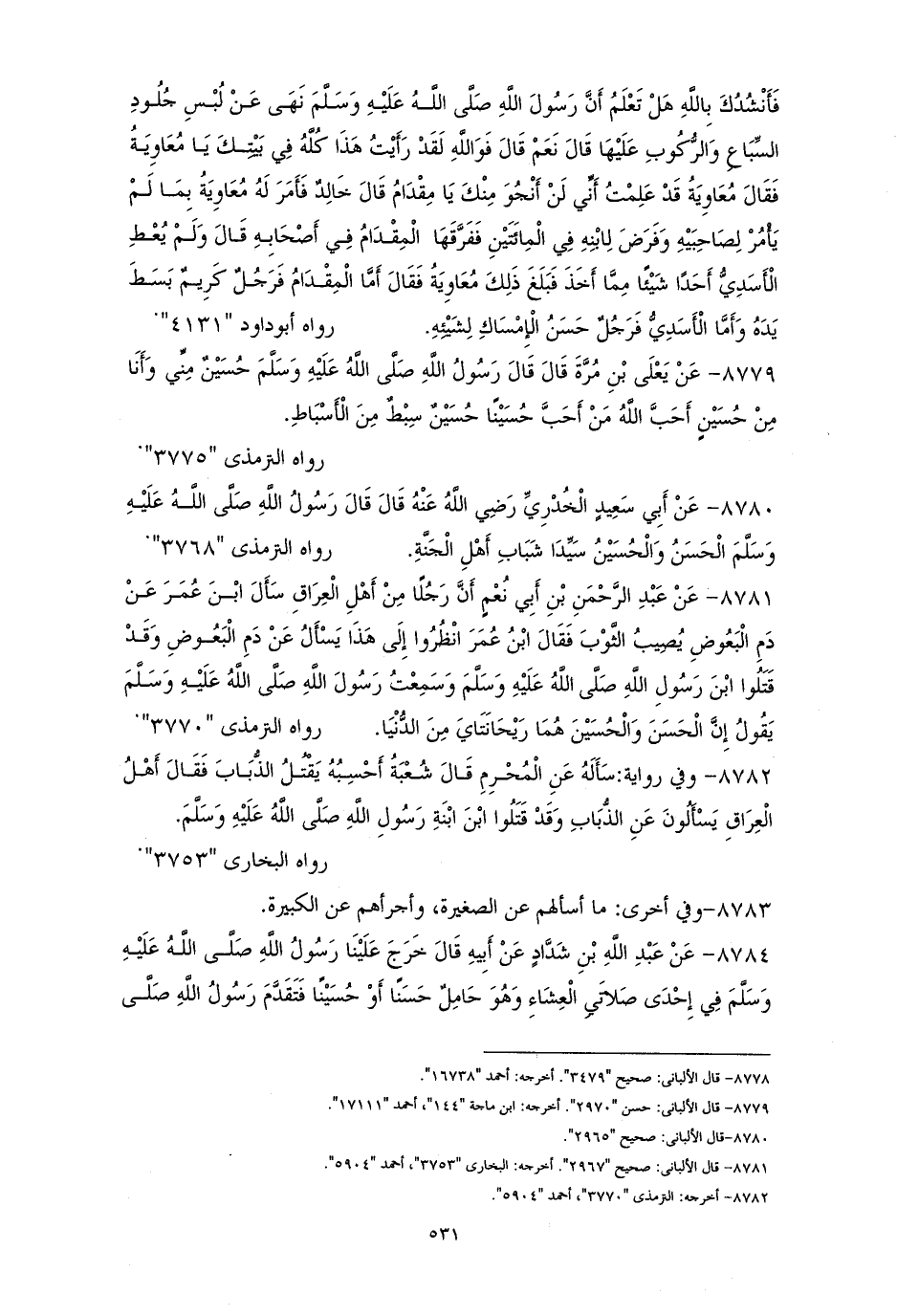 8779 - يعلى بن مرة رفعه: ((حسينٌ مني وأنا من حسينٍ، أحبَّ الله من أحبَّ حسينًا، حسينٌ سبطٌ من الأسباطِ)) (¬1).