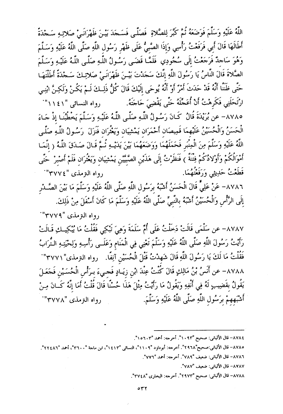 8787 - سلمى امرأة من الأنصار دخلتُ على أمِّ سلمةَ وهي تبكي قلتُ: ما يبكيكِ؟ قالت: رأيتُ الآن رسولَ الله - صلى الله عليه وسلم - في المنامِ وعلى رأسِهِ ولحيتهِ الترابُ وهو يبكي، فقلتُ: ما لك يا رسول الله؟ فقال: ((شهدتُ قتل الحسين آنفًا)). هما للترمذي (¬1).