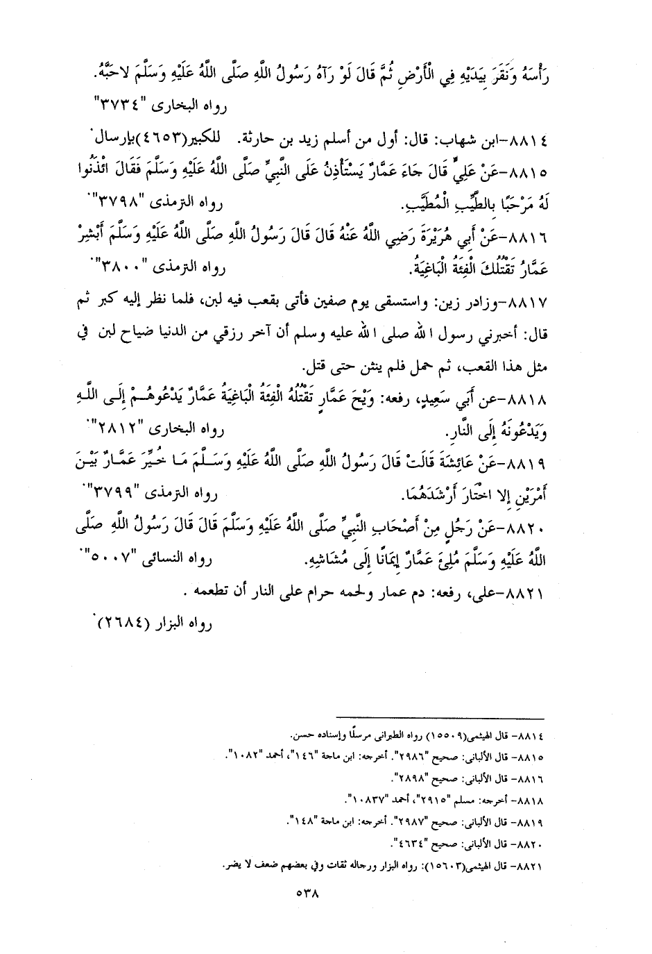 8820 - رَجُلٌ منَ الصحابة رفعهُ: ((مُلئَ عمَّارٌ إيمانًا إلى مُشاشهِ)). للنسائي (¬1).
