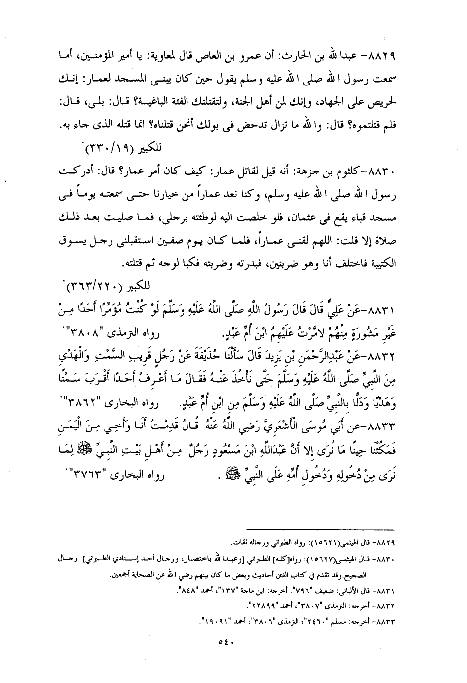 8829 - عبد الله بن الحارث: أن عمرو بن العاص قال لمعاوية: يا أمير المؤمنين، أما سمعت رسولَ الله - صلى الله عليه وسلم - يقول حين كان يبني المسجد لعمار: «إنك لحريصٌ على الجهاد، وإنك لمن أهل الجنة، ولتقتلنك الفئة الباغية». قال: بلى. فلم قتلتموه؟! ما تزال تدحض في بولك، أنحن قتلناه؟ إنما قتله الذي جاء به» (¬1).