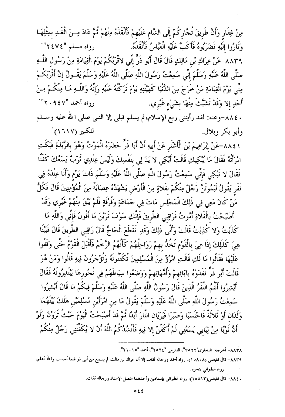 8839 - أَبُو ذَرٍّ: إِنِّي لَأَقْرَبُكُمْ يَوْمَ الْقِيَامَةِ مِنْ رَسُولِ الله - صلى الله عليه وسلم -؛ إِنِّي سمعتُهُ يَقُولُ: «إِنَّ أَقْرَبَكُمْ مِنِّي يَوْمَ الْقِيَامَةِ مَنْ خَرَجَ مِنْ الدُّنْيَا كَهَيْئَتِهِ يَوْمَ تَرَكْتُهُ وَإِنَّهُ وَالله مَا مِنْكُمْ مِن أَحَدٍْ إِلَّا وَقَدْ تَشَبَّثَ مِنْهَا بِشَيْءٍ غَيْرِي» (¬1). لأحمد والكبير.
