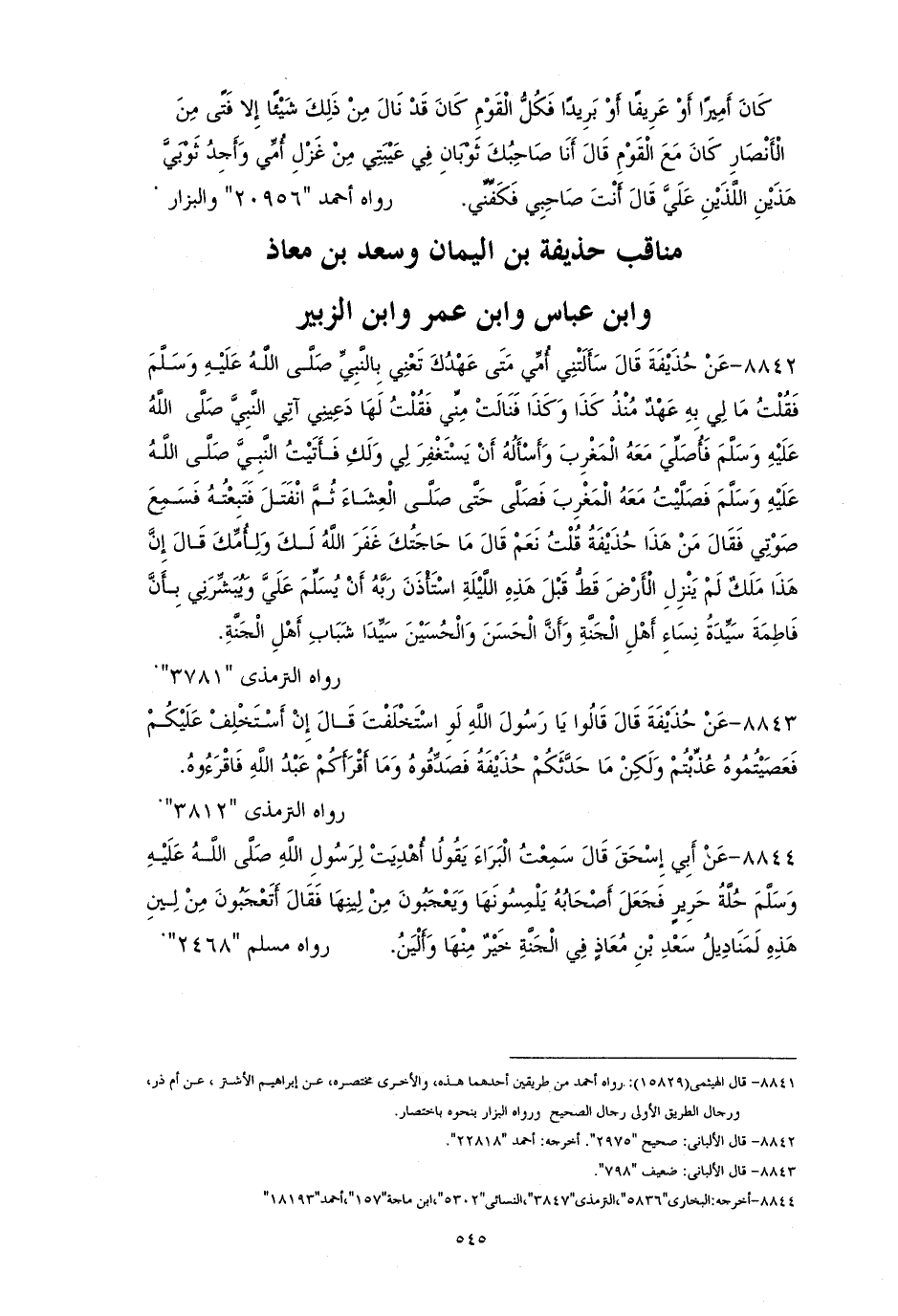 8842 - حُذَيْفَةَ: سَأَلَتْنِي أُمِّي مَتَى عَهْدُكَ برسول الله فَقُلْتُ: مَا لِي بِهِ عَهْدٌ مُنْذُ كَذَا وَكَذَا فَنَالَتْ مِنِّي. فَقُلْتُ: دَعِينِي آتيه فَأُصَلِّيَ مَعَهُ الْمَغْرِبَ وَأَسْأَلُهُ أَنْ يَسْتَغْفِرَ لِي وَلَكِ فَأَتَيْتُه فَصَلَّيْتُ مَعَهُ الْمَغْرِبَ ثم قام يصلي حَتَّى صَلَّى الْعِشَاءَ ثُمَّ انْفَتَلَ فَتَبِعْتُهُ فَسَمِعَ صَوْتِي فَقَالَ: «مَنْ هَذَا حُذَيْفَةُ؟» قُلْتُ: نَعَمْ قَالَ: «مَا حَاجَتُكَ غَفَرَ الله لَكَ وَلِأُمِّكَ؟ قَالَ إِنَّ هَذَا مَلَكٌ لَمْ يَنْزِلْ إلى الْأَرْضَ قَطُّ قَبْلَ هَذِهِ اللَّيْلَةِ اسْتَأْذَنَ رَبَّهُ أَنْ يُسَلِّمَ عَلَيَّ وَيُبَشِّرَنِي ِأَنَّ فَاطِمَةَ سَيِّدَةُ نِسَاءِ أَهْلِ الْجَنَّةِ وَأَنَّ الْحَسَنَ وَالْحُسَيْنَ سَيِّدَا شَبَابِ أَهْلِ الْجَنَّةِ» (¬1).