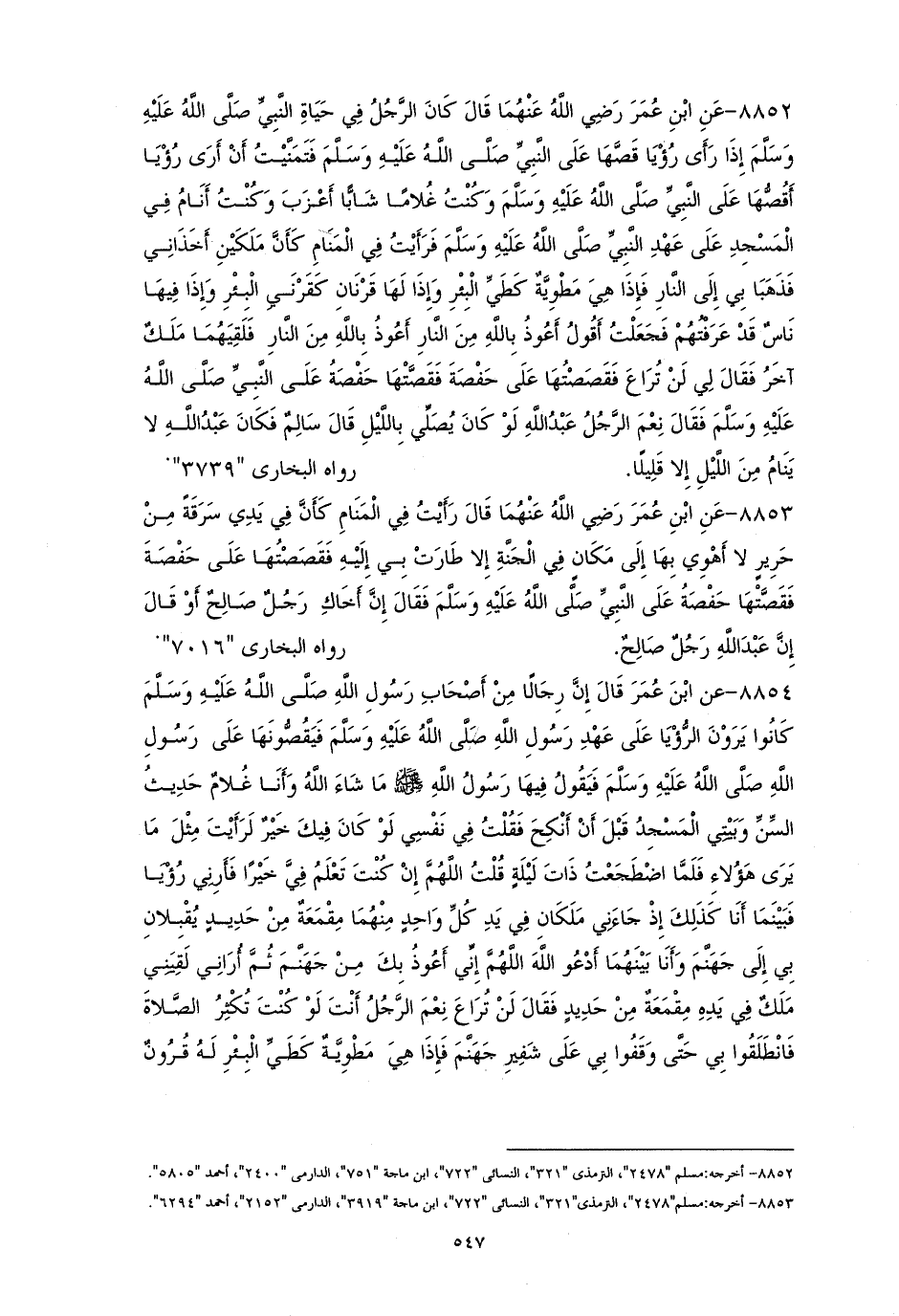 8852 - ابْنِ عُمَرَ: كَانَ الرَّجُلُ فِي حَيَاةِ النَّبِيِّ - صلى الله عليه وسلم - إِذَا رَأَى رُؤْيَا قَصَّهَا عليه فَتَمَنَّيْتُ أَنْ أَرَى رُؤْيَا أَقُصُّهَا عليه، وَكُنْتُ غُلَامًا شَابًّا َعْزَبًَا أَنَامُ فِي الْمَسْجِدِ فَرَأَيْتُ فِي الْمَنَامِ كَأَنَّ مَلَكَيْنِ أَخَذَانِي فَذَهَبَا بِي إِلَى النَّارِ فَإِذَا هِيَ مَطْوِيَّةٌ كَطَيِّ الْبِئْرِ، وَإِذَا لَهَا قَرْنَانِ كَقَرْنَيْ الْبِئْرِ، وَإِذَا فِيهَا أنَاسٌ قَدْ عَرَفْتُهُمْ فَجَعَلْتُ أَقُولُ: أَعُوذُ بِالله مِنْ النَّارِ فلقيهم مَلَكٌ آخَرُ، فَقَالَ لِي لم ترع فَقَصَصْتُهَا عَلَى حَفْصَةَ فَقَصَّتْهَا حَفْصَةُ عَلَى النَّبِيِّ - صلى الله عليه وسلم - فَقَالَ: «نِعْمَ الرَّجُلُ عَبْدُ الله لَوْ كَانَ يُصَلِّي من الليل» قَالَ سَالِمٌ: فَكَانَ عَبْدُ الله لَا يَنَامُ مِنْ اللَّيْلِ إِلَّا قَلِيلًا (¬1)