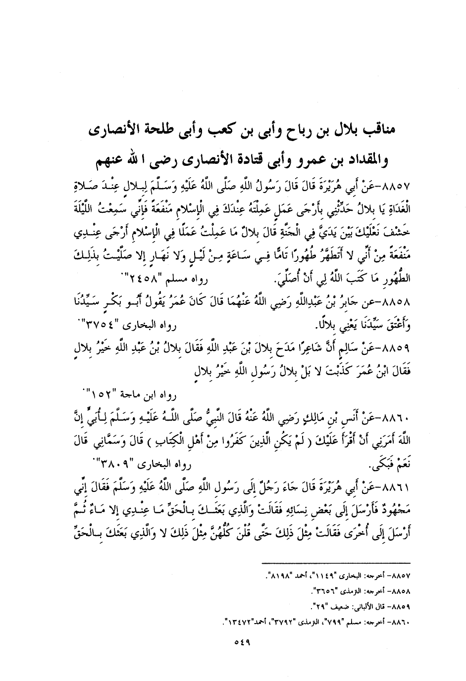 8857 - أبو هُرَيْرَةَ: قَالَ النبيُّ - صلى الله عليه وسلم - لِبِلالٍ عِنْدَ صَلَاةِ الْغَدَاةِ: «حَدِّثْنِي بِأَرْجَى عَمَلٍ عَمِلْتَهُ فِي الْإِسْلَامِ مَنْفَعَةً، فَإِنِّي سَمِعْتُ اللَّيْلَةََََ خَشْفَ نَعْلَيْكَ بَيْنَ يَدَيَّ فِي الْجَنَّةِ» قَالَ بِلَالٌ: مَا عَمِلْتُ عَمَلًاً فِي الْإِسْلَامِ أَرْجَى عِنْدِي مَنْفَعَةً مِنْ أَنِّي لَا أَتَطَهَّرُ طُهُورًا تَامًّا فِي سَاعَةٍ مِنْ لَيْلٍ أو نَهَارٍ إِلَّا صَلَّيْتُ بِذَلِكَ الطُّهُورِ مَا كَتَبَ الله لِي أَنْ أُصَلِّيَ (¬1). للشيخين.
