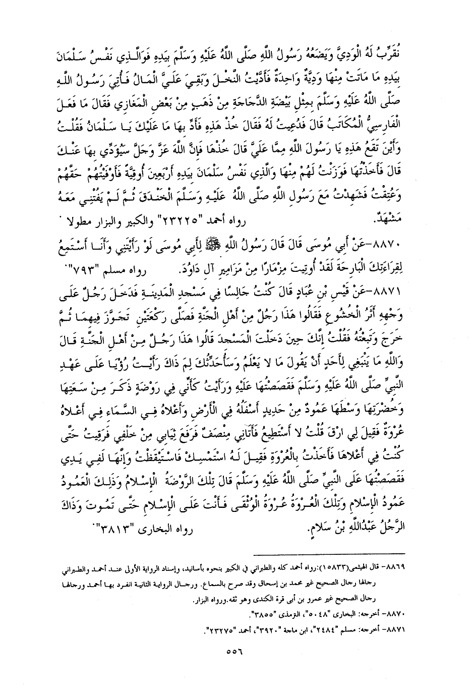 8871 - قيس بن عباد: قَالَ كُنْتُ جالسًا في مسجد المدينة فِي نَاسٍ فِيهِمْ بَعْضُ الصحابة فَجَاءَ رَجُلٌ فِي وَجْهِهِ أَثَرٌ مِنْ خُشُوعٍ، فَقَالَ بَعْضُ الْقَوْمِ: هَذَا رَجُلٌ مِنْ أَهْلِ الْجَنَّةِ فَصَلَّى رَكْعَتَيْنِ َتَجَوَّزُ فِيهِمَا ثُمَّ خَرَجَ فَاتَّبَعْتُهُ فَدَخَلَ مَنْزِلَهُ وَدَخَلْتُ فَتَحَدَّثْنَا فَلَمَّا اسْتَأْنَسَ قُلْتُ: إِنَّكَ لَمَّا دَخَلْتَ قَالَ رَجُلٌ: كَذَا وَكَذَا قَالَ: سُبْحَانَ الله مَا يَنْبَغِي لِأَحَدٍ أَنْ يَقُولَ مَا لَا يَعْلَمُ وَسَأُحَدِّثُكَ لِمَ ذَاكَ: رَأَيْتُ رُؤْيَا عَلَى عَهْدِ النبي - صلى الله عليه وسلم - رَأَيْتُنِي فِي رَوْضَةٍ ذَكَرَ سَعَتَهَا وَعُشْبَهَا وَخُضْرَتَهَا وَوَسْطَ الرَّوْضَةِ عَمُودٌ مِنْ حَدِيدٍ أَسْفَلُهُ فِي الْأَرْضِ وَأَعْلَاهُ فِي السَّمَاءِ فِي أَعْلَاهُ عُرْوَةٌ فَقِيلَ لِي: ارْقَهْ فَقُلْتُ: لَا أَسْتَطِيعُ فَجَاءَنِي وصيفٌ فقَالَ بثيابي من خلفي وصف أنه رفعه من خلف بيده، فرقيت حتى كنت في أعلى العمود، فأخذت بالعروة، فقيل لي: استمسك، لقد استيقظت وإنها لفي يدي، فقصصتها على النبي - صلى الله عليه وسلم - فقال: «تلك الروضة الإسلام، وذلك العمود عمود الإسلام، وتلك العروة عروة الوثقي، وأنت على الإسلام حتى تموت، والرجل عبد الله بن سلام». (¬1).