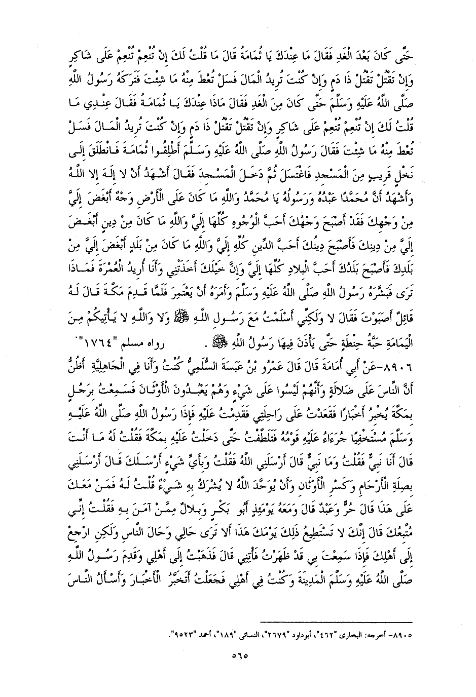 8906 - عمرو بن عبسة: كُنْتُ وَأَنَا فِي الْجَاهِلِيَّةِ أَظُنُّ أَنَّ النَّاسَ عَلَى الضَّلَالَةٍ وَأَنَّهُمْ لَيْسُوا عَلَى شَيْءٍ وَهُمْ يَعْبُدُونَ الْأَوْثَانَ فَسَمِعْتُ بِرَجُلٍ بِمَكَّةَ يُخْبِرُ أَخْبَارًا فَقَعَدْتُ عَلَى رَاحِلَتِي فَقَدِمْتُ عَلَيْهِ فَإِذَا رَسُولُ الله - صلى الله عليه وسلم - مُسْتَخْفِيًا جرءاء عليه قومه. فتلطفت حتى دخلت عليه فقلت له: ما أنت؟ فقال «أنا نبي». فقلت: وما نبي؟ قال: «أرسلني الله»، فقلت: فبأي شيء أرسلك الله؟ قال: «أبصلة أرحام، وكسر الأوثان، وأن يوحد الله ولا يشرك به شيءٌ»، قلت له: فمن معك على هذا؟ قال «حر وعبد» ومعه يومئذ ممن آمن به أبو بكر وبلال قلت: إني متبعك، قال: «إنك لا تستطيع ذلك يومك هذا ألا ترى حالي وحال الناس؟ ولكن ارجع إلى أهلك فإذا سمعت أني قد ظهرت فأتني» فذهبت إلى أهلي، وقدم - صلى الله عليه وسلم - المدينة وكنت في أهلي، فَجَعَلْتُ أَتَخَبَّرُ الْأَخْبَارَ وَأَسْأَلُ النَّاسَ