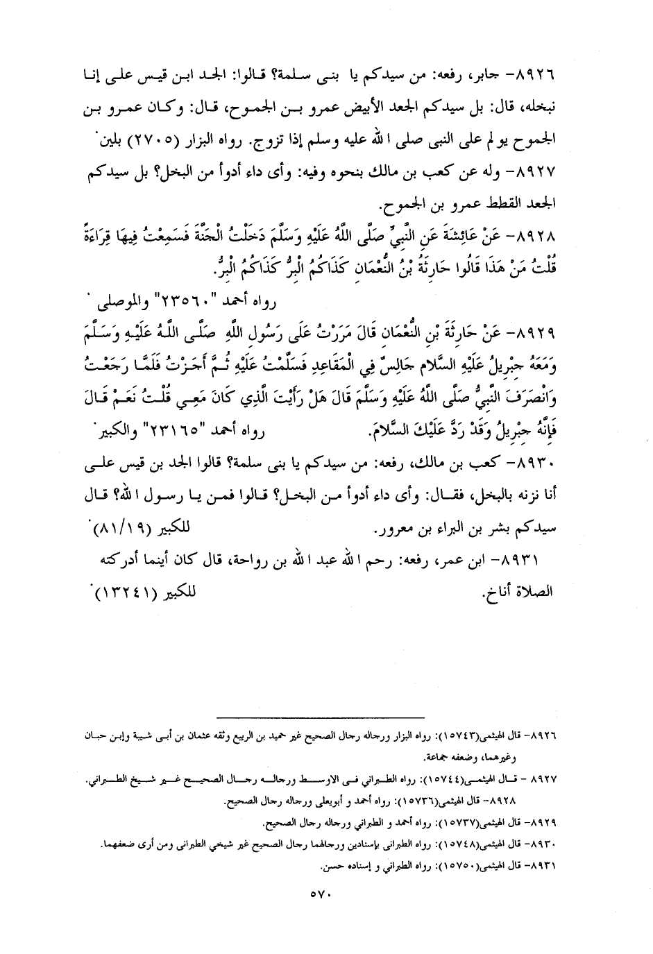 8926 - جابر رفعه: «من سيدكم يا بني سلمة؟» قالوا: الجد بن قيس على أنا نبَخِّلُهُ، قال: «بل سيدكم الجعد الأبيض عمرو بن الجموح»، قال: وكان عمرو بن الجموح يؤلم على النبي - صلى الله عليه وسلم - إذا تزوج. للبزار بلين (¬1)