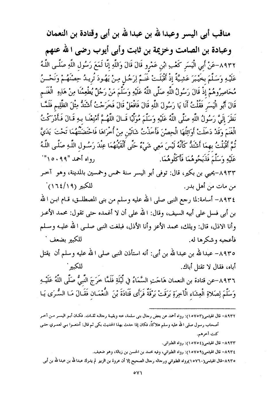 مناقب أبي اليسر وعبد الله بن عبد الله بن أبيّ، وقتادة بن النعمان وعبادة بن الصامت وخزيمة بن ثابت وأبي أيوب - رضي الله عنهم -