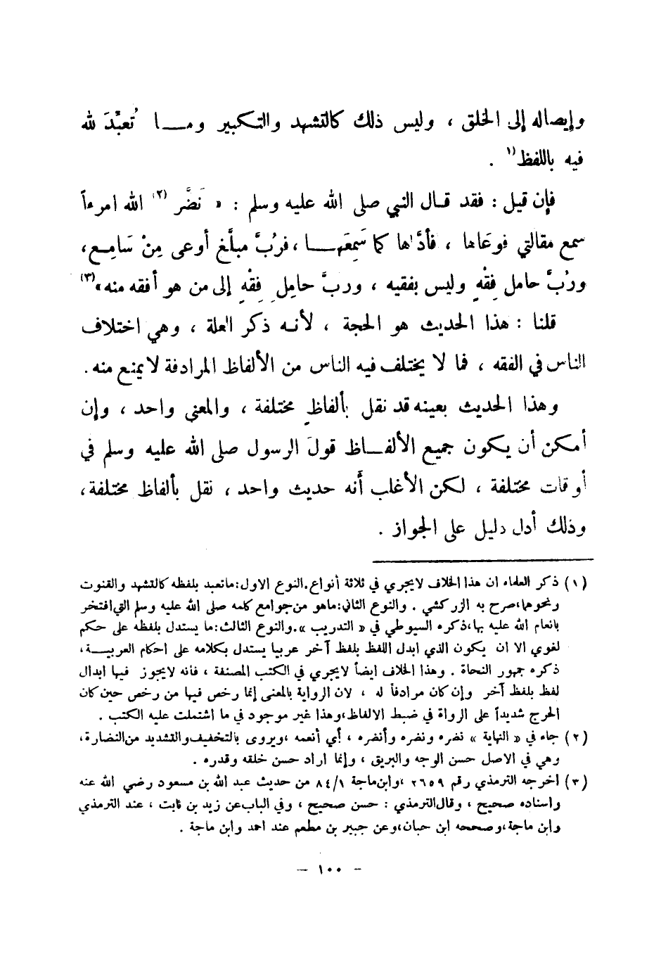 (¬1) ذكر العلماء أن هذا الخلاف لا يجري في ثلاثة أنواع. النوع الأول: ما تعبد بلفظه كالتشهد والقنوت ونحوهما، صرح به الزركشي. والنوع الثاني: ما هو من جوامع كلمه صلى الله عليه وسلم التي افتخر بإنعام الله عليه بها، ذكره السيوطي في " التدريب ". والنوع الثالث: ما يستدل بلفظه على حكم لغوي إلا أن يكون الذي أبدل اللفظ بلفظ آخر عربياً يستدل بكلامه على أحكام العربية، ذكره جمهور النحاة. وهذا الخلاف أيضاً لا يجري في الكتب المصنفة، فإنه لا يجوز فيها أبدال لفظ بلفظ آخر وإن كان مرادفاً له، لأن الرواية بالمعنى إنما رخص فيها من رخص حين كان الحرج شديداً على الرواة في ضبط الألفاظ، وهذا غير موجود في ما اشتملت عليه الكتب.