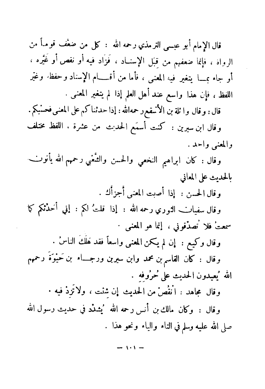 قال الإمام أبو عيسى الترمذي - رحمه الله -: كل من ضعَّف قوماً من الرواة، فإنما ضعفهم من قِبَل الإسناد، فزاد فيه أو نقص أو غَيَّره أو جاء بما يتغير فيه المعنى، فأما من أقام الإسناد وحفظه وغيّر اللفظ، فإن هذا واسع عند أهل العلم إذا لم يتغير المعنى.