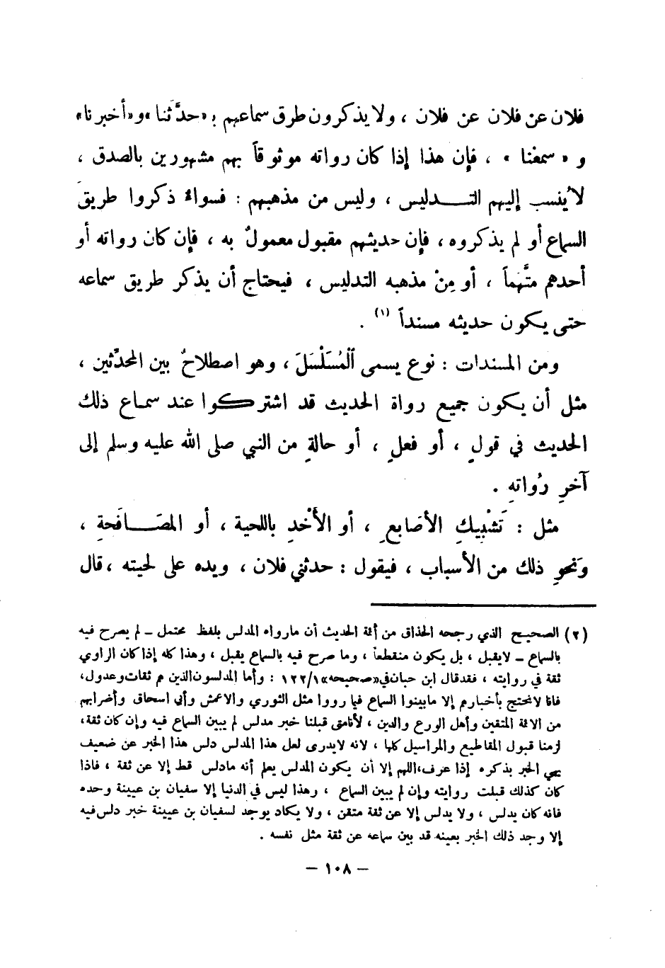 فلان عن فلان عن فلان، ولا يذكرون طرق سماعهم بـ: «حدَّثنا» و «أخبرنا» و «سمعنا» ، فإن هذا إذا كان رواته موثوقًا بهم مشهورين بالصدق، لا يُنسب إليهم التدليس، وليس من مذهبهم: فسواءٌ ذكروا طريق السماع أو لم يذكروه، فإن حديثهم مقبول معمولٌ به، فإن كان رواته أو أحدهم متهمًا، أو مِن مذهبه التدليس، فيحتاج أن يذكر طريق سماعه حتى يكون حديثه مسندًا (¬1) .