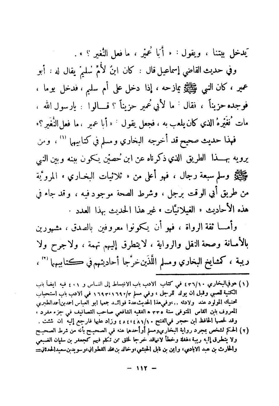 وفي حديث القاضي إسماعيل قال: كان ابنٌ لأم سُليم يقال له: أبو عمير، كان النبي - صلى الله عليه وسلم - يمازحه، إذا دخل على أم سليم، فدخل يومًا، فوجده حزينًا، فقال: ما لأبي عُمير حزينًا؟ قالوا: يا رسول الله، مات نُغَيْره الذي كان يلعب به، فجعل يقول: «أبا عمير، ما فعل النُّغير؟» . فهذا حديث صحيح قد أخرجه البخاري ومسلم في كتابيهما (¬1) ، ومن يرويه بهذا الطريق الذي ذكرناه عن ابن حُصَين يكون بينه وبين النبي - صلى الله عليه وسلم - سبعة رجال، فهو أعلى من «ثلاثيات البخاري» المروية من طريق أبي الوقت برجل، وشرط الصحة موجود فيه، وقد جاء في هذه الأحاديث «الغيلانيَّات» غير هذا الحديث بهذا العدد.