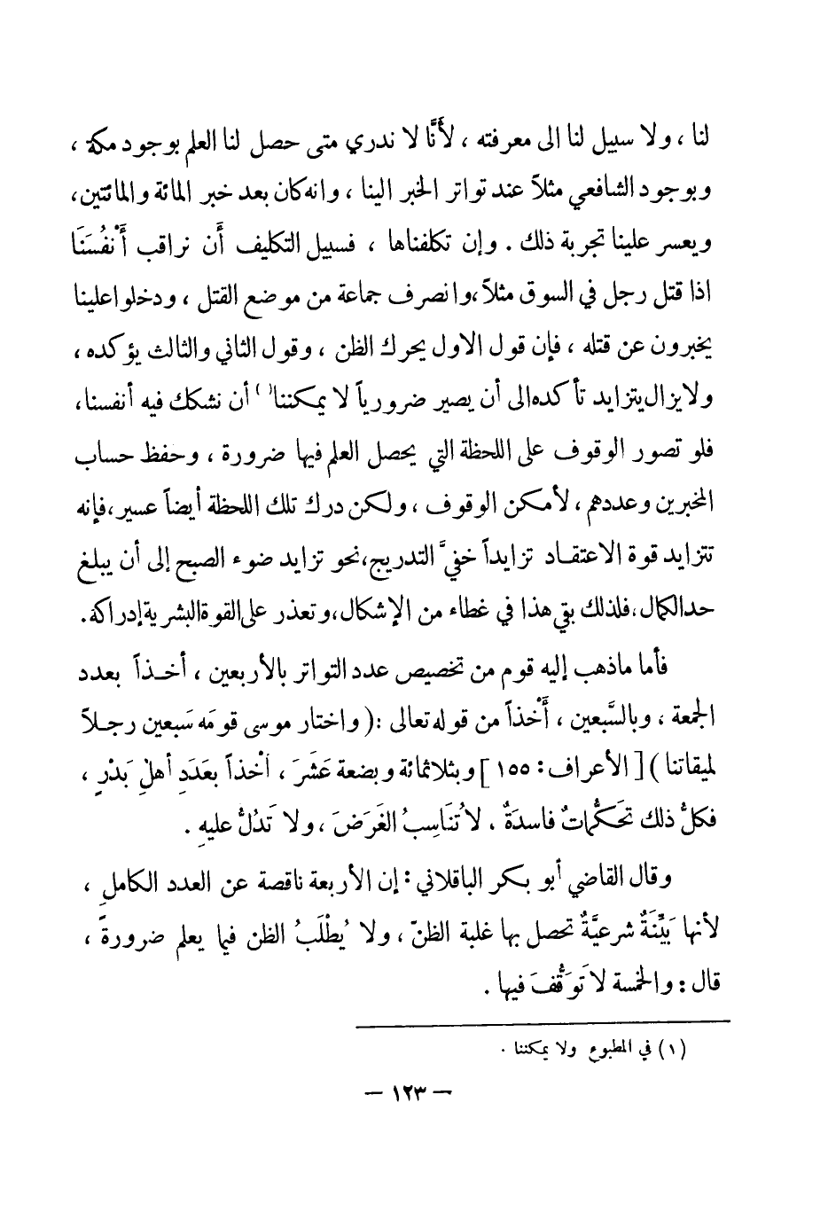 لا ندري متى حصل لنا العلم بوجود مكة، وبوجود الشافعي مثلاً عند تواتر الخبر إلينا، وأنه كان بعد خبر المائة والمائتين، ويعسر علينا تجربة ذلك، وإن تكلفناها، فسبيل التكليف أن نراقب أنفسنا إذا قتل رجل في السوق مثلاً وانصرف جماعة من موضع القتل، ودخلوا علينا يخبرون عن قتله، فإن قول الأول يحرك الظن، وقول الثاني والثالث يؤكده، ولا يزال يتزايد تأكده إلى أن يصير ضروريًا لا يمكننا (¬1) أن نشكك فيه أنفسنا.