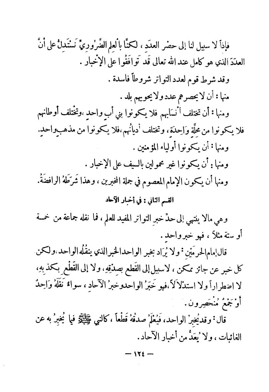 قال إمام الحرمين: ولا يُراد بخبر الواحد الخبر الذي ينقله الواحد، ولكن كل خبر عن جائز ممكن، لا سبيل إلى القطع بصدقه، ولا إلى القطع بكذبه، لا اضطرارًا ولا استدلالاً، فهو خبر الواحد وخبر الآحاد، سواء نقله واحد أو جمع منحصرون.