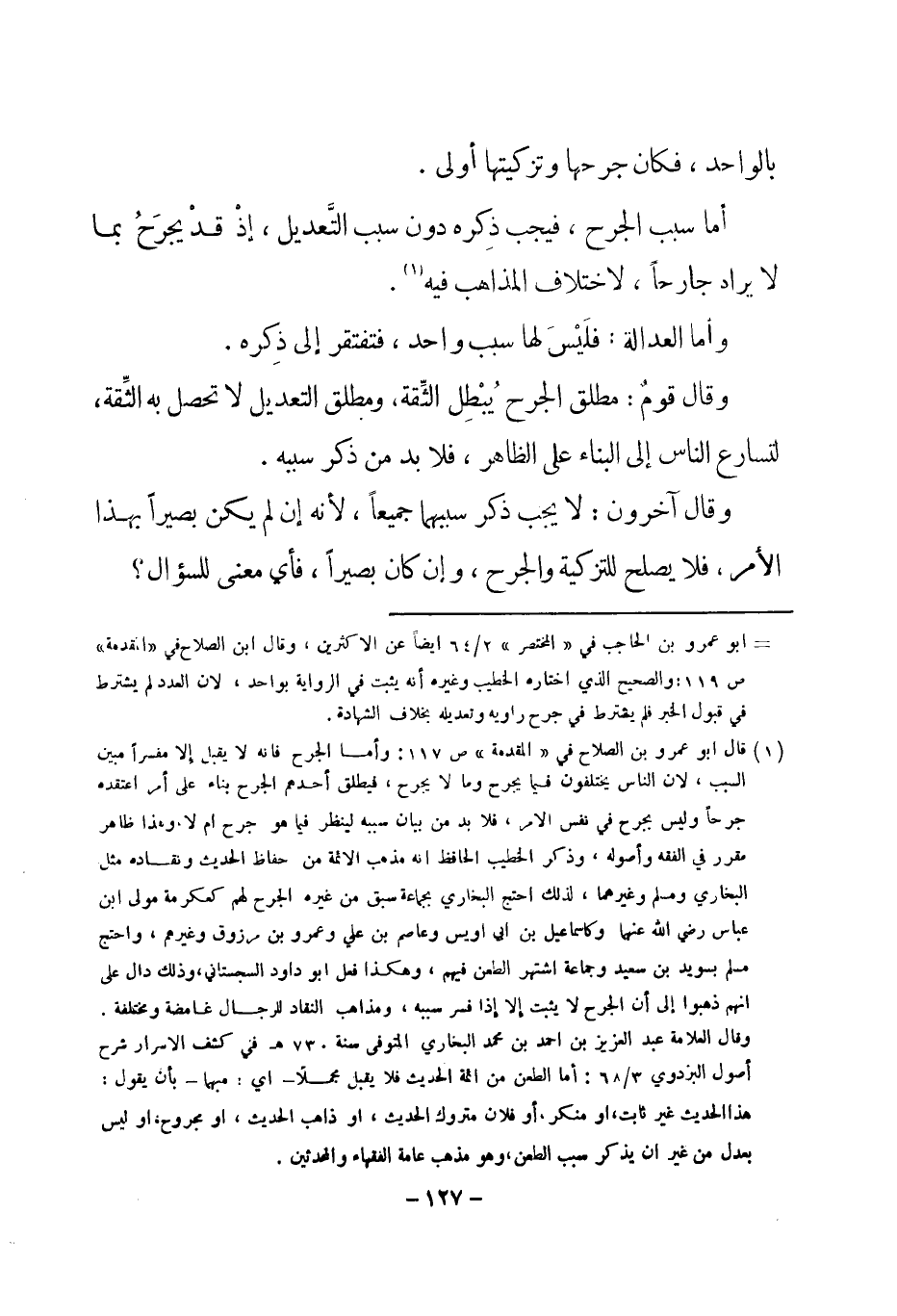 (¬1) قال أبو عمرو بن الصلاح في " المقدمة " ص 117: وأما الجرح فإنه لا يقبل إلا مفسراً مبين السبب، لأن الناس يختلفون فيما يجرح وما لا يجرح، فيطلق أحدهم الجرح بناء على أمر اعتقده جرحاً، وليس بجرح في نفس الأمر، فلا بد من بيان سببه لينظر فيما هو جرح أم لا. وهذا ظاهر مقرر في الفقه وأصوله، وذكر الخطيب الحافظ أنه مذهب الأئمة من حفاظ الحديث ونقاده مثل البخاري ومسلم وغيرهما، لذلك احتج البخاري بجماعة سبق من غيره الجرح لهم كعكرمة مولى ابن عباس رضي الله عنهما وكإسماعيل بن أبي أويس وعاصم بن علي وعمرو بن مرزوق وغيرهم، واحتج مسلم بسويد بن سعيد وجماعة اشتهر الطعن فيهم، وهكذا فعل أبو داود السجستاني، وذلك دال على أنهم ذهبوا إلى أن الجرح لا يثبت إلا إذا فسر سببه، ومذاهب النقاد للرجال غامضة ومختلفة. وقال العلامة عبد العزيز بن أحمد بن محمد بن البخاري المتوفى سنة 730 هـ في كشف الأسرار شرح أصول البزدوي 3/68: أما الطعن من أئمة الحديث فلا يقبل مجملاً – أي: مبهماً – بأن يقول: هذا الحديث غير ثابت، أو منكر، أو فلان متروك الحديث، أو ذاهب الحديث، أو مجروح، أو ليس بعدل من غير أن يذكر سبب الطعن، وهو مذهب عامة الفقهاء والمحدثين.