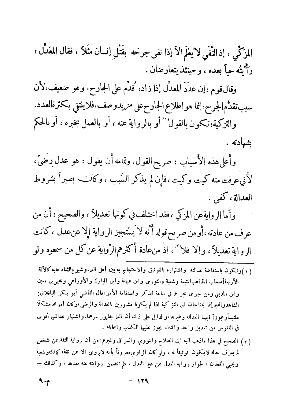 (¬2) الصحيح في هذا ما ذهب إليه ابن الصلاح والنووي والعراقي وغيرهم، من أن رواية الثقة عن شخص لم يعرف حاله لا يكون توثيقاً له، ولو كان الراوي معروفاً بأنه لا يروي إلا عن ثقة، كمالك وشعبة ويحيى القطان، لجواز رواية العدل عن غير العدل، فلم تتضمن روايته عنه تعديله، وكذلك -[130]- لا يجزئ التعديل على الابهام من غير تسمية المعدل، فإذا قال: حدثني الثقة، أو نحو ذلك مقتصراً عليه، لم يكتف به على الصحيح حتى يسميه، لأنه وإن كان ثقة عنده فربما لو سماه لكان ممن جرحه غيره بجرح قادح، بل إضرابه عن تسميته ريبة توقع تردداً في القلب، قال السخاوي: من كان لا يروي إلا عن ثقة إلا في النادر: الإمام أحمد، وبقي بن مخلد، وحريز بن عثمان، وسليمان بن حرب وشعبة والشعبي وعبد الرحمن بن مهدي ومالك ويحيى بن سعيد القطان.
