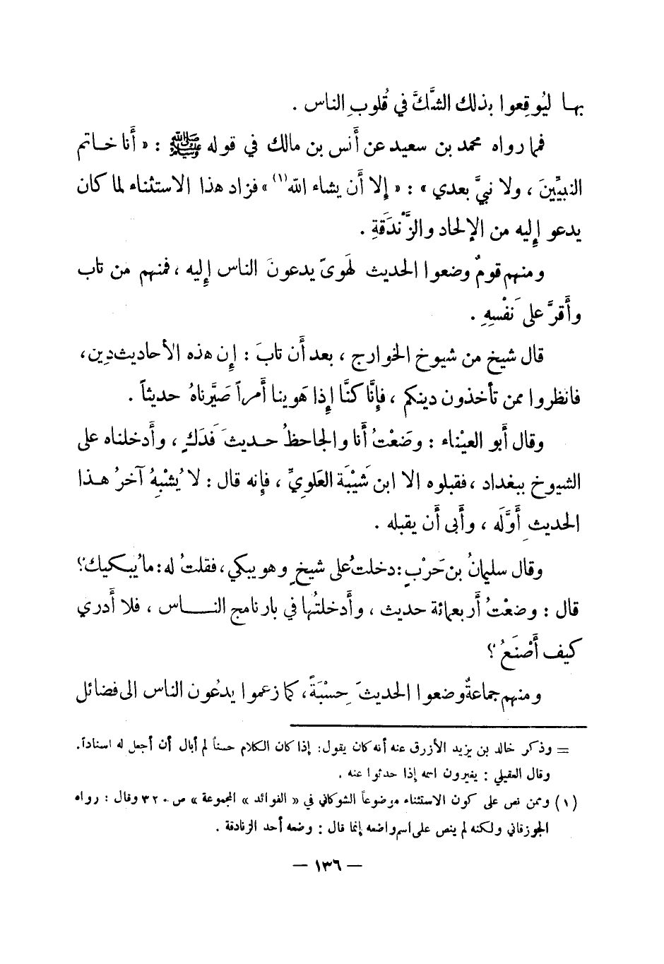 (¬1) وممن نص على كون الاستثناء موضوعاً الشوكاني في " الفوائد " المجموعة ص 320 وقال: رواه الجوزقاني ولكنه لم ينص على اسم واضعه إنما قال: وضعه أحد الزنادقة.