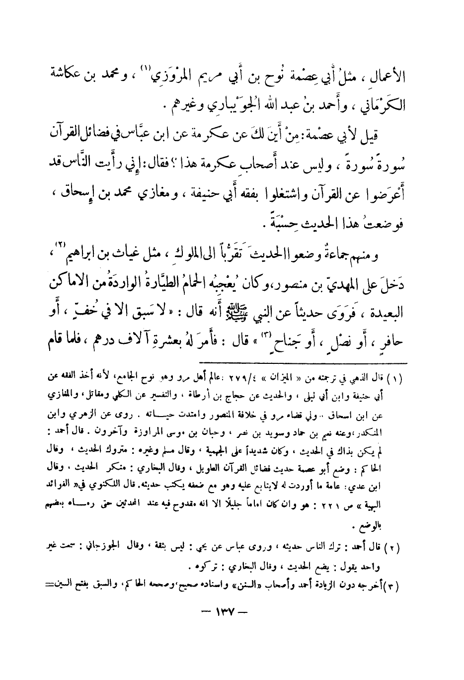 (¬1) قال الذهبي في ترجمته من " الميزان " 4/279: عالم أهل مرو وهو نوح الجامع، لأنه أخذ الفقه عن أبي حنيفة وابن ليلى، والحديث عن حجاج بن أرطاة، والتفسير عن الكلبي ومقاتل، والمغازي عن ابن إسحاق، ولي قضاء مرو في خلافة المنصور وامتدت حياته. روى عن الزهري وابن المنكدر، وعنه نعيم بن حماد وسويد بن نصر، وحبان بن موسى المراوزة وآخرون. قال أحمد: لم يكن بذاك في الحديث، وكان شديداً على الجهمية، وقال مسلم وغيره: متروك الحديث، وقال الحاكم: وضع أبو عصمة حديث فضائل القرآن الطويل، وقال البخاري: منكر الحديث، وقال ابن عدي: عامة ما أوردت له لا يتابع عليه وهو مع ضعفه يكتب حديثه. قال اللكنوي في" الفوائد البهية " ص 221: هو وإن كان إماماً جليلاً إلا أنه مقدوح فيه عند المحدثين حتى رماه بعضهم بالوضع.