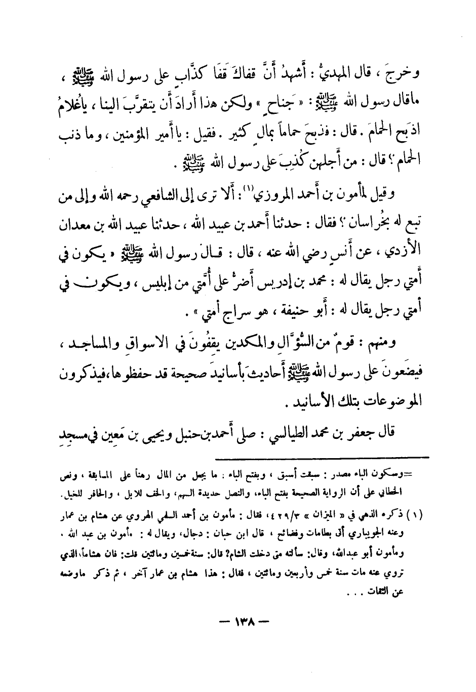 وخرج، قال المهدي: أشهد أن قفاك قفا كذاب على رسول الله - صلى الله عليه وسلم-، ما قال رسول الله - صلى الله عليه وسلم-: «جناح» ولكن هذا أراد أن يتقرب إلينا، يا غلام اذبح الحمام، قال: فذبح حمامًا بمال كثير. فقيل: يا أمير المؤمنين، وما ذنب الحمام؟ قال: من أجلهن كُذب على رسول الله - صلى الله عليه وسلم-.
