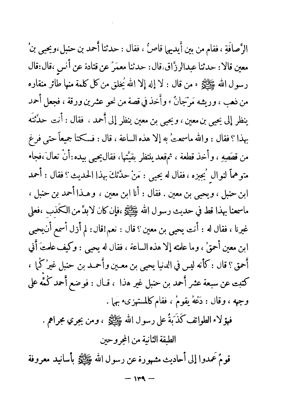 الرصافة، فقام من بين أيديهما قاص، فقال: حدثنا أحمد بن حنبل، ويحيى بن معين قالا: حدثنا عبد الرزاق، قال: حدثنا معمر عن قتادة عن أنس، قال: قال رسول الله - صلى الله عليه وسلم-: «من قال لا إله إلا الله يُخلق من كلمة منها طائر منقاره من ذهب، وريشه مرجان، وأخذ في قصة من نحو عشرين ورقة، فجعل أحمد ينظر إلى يحيى بن معين، ويحيى بن معين ينظر إلى أحمد، فقال: أنت حدثته بهذا؟ فقال: والله ما سمعت به إلا هذه الساعة، قال: فسكتا جميعًا حتى فرغ من قصصه. وأخذ قطعة، ثم قعد ينتظر بقيتها، فقال يحيى بيده: أن تعال، فجاء متوهمًا لنوال يجيزه، فقال له يحيى: من حدثك بهذا الحديث؟ فقال: أحمد بن حنبل، ويحيى بن معين، فقال: أنا ابن معين، وهذا أحمد بن حنبل، ما سمعنا بهذا قط في حديث رسول الله - صلى الله عليه وسلم-، فإن كان لابد من الكذب، فعلى غيرنا، فقال له: أنت يحيى بن معين؟ قال: نعم، قال: لم أزل أسمع أن يحيى بن معين أحمق، وما علمته إلا هذه الساعة، فقال له يحيى: وكيف علمت أني أحمق؟ قال: كأنه ليس في الدنيا يحيى بن معين وأحمد بن حنبل غيركما، كتبت عن سبعة عشر أحمد بن حنبل غير هذا، قال: فوضع أحمد كمَّه على وجهه، وقال: دعه يقوم، فقام كالمستهزئ بهما.