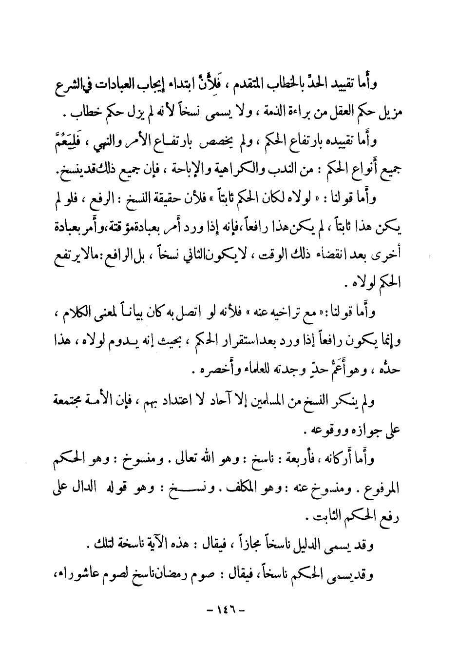 وأما قولنا: «لولاه لكان الحكم ثابتًا» فلأن حقيقة النسخ: الرفع، فلو لم يكن هذا ثابتًا، لم يكن هذا رافعًا، فإنه إذا ورد أمر بعبادة مؤقتة، وأمر بعبادة أخرى بعد انقضاء ذلك الوقت، لا يكون الثاني نسخًا، بل الرافع: ما لا يرتفع الحكم لولاه.