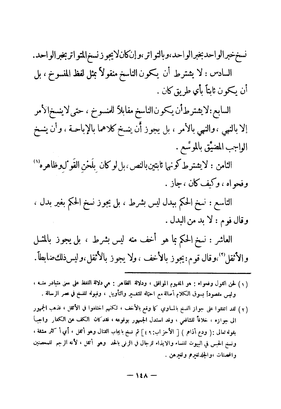 السادس: لا يشترط أن يكون الناسخ منقولاً بمثل لفظ المنسوخ، بل أن يكون ثابتًا بأي طريق كان.