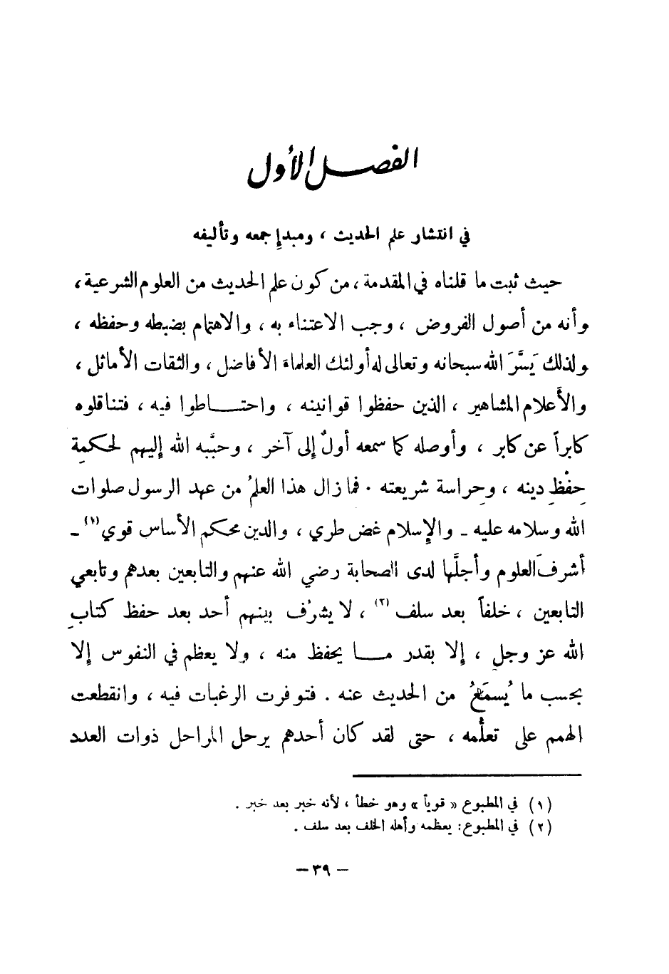 الفصل الأول: في انتشار علم الحديث، ومبدإِ جمعه وتأليفه