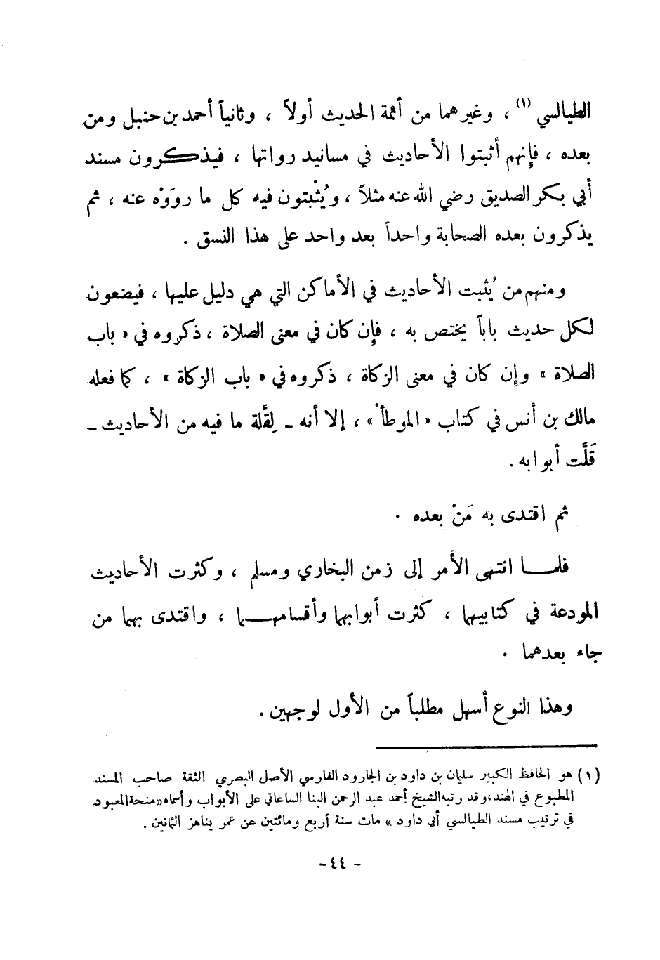 الطيالسي (¬1) وغيرهما من أئمة الحديث أولاً وثانياً أحمد بن حنبل ومن بعده، فإنهم أثبتوا الأحاديث في مسانيد رواتها، فيذكرون مسند أبي بكر الصديق - رضي الله عنه - مثلاً، ويثبتون فيه كل ما رووه عنه، ثم يذكرون بعده الصحابة واحداً بعد واحد على هذا النسق.