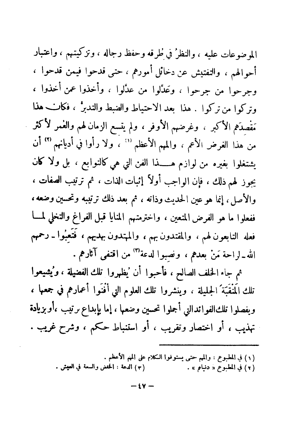 الموضوعات عليه، والنظر في طرقه وحفظ رجاله، وتزكيتهم، واعتبار أحوالهم، والتفتيش عن دخائل أمورهم، حتى قدحوا فيمن قدحوا، وجرحوا من جرحوا، وعدَّلوا من عدَّلوا، وأخذوا عمن أخذوا، وتركوا من تركوا. هذا بعد الاحتياط والضبط والتدبر، فكان هذا مقصدهم الأكبر، وغرضهم الأوفر، ولم يتسع الزمان لهم والعمر لأكثر من هذا الغرض الأعم، والمهم الأعظم (¬1) ، ولا رأوا في أديانهم (¬2) أن يشتغلوا بغيره من لوازم هذا الفن التي هي كالتوابع، بل ولا كان يجوز لهم ذلك، فإن الواجب أولاً إثبات الذات، ثم ترتيب الصفات، والأصل، إنما هو عين الحديث وذاته، ثم بعد ذلك ترتيبه وتحسين وضعه، ففعلوا ما هو الفرض المتعين، واخترمتهم المنايا قبل الفراغ والتخلي لما فعله التابعون لهم، والمقتدون بهم، والمهتدون بهديهم، فتعبوا - رحمهم الله - لراحة من بعدهم، ونصبوا لدعة (¬3) من اقتفى آثارهم.