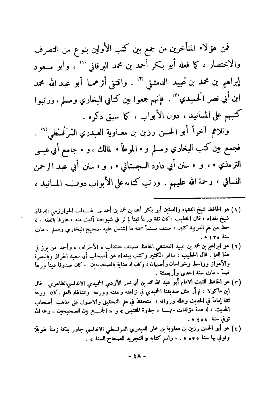فمن هؤلاء المتأخرين من جمع بين كتب الأولين بنوع من التصرف والاختصار، كما فعله أبو بكر أحمد بن محمد البرقاني (¬1) ، وأبو مسعود إبراهيم ين محمد بن عبيد الدمشقي (¬2) ، واقتفى أثرهما أبو عبد الله محمد بن أبي نصر الحميدي (¬3) . فإنهم جمعوا بين كتابي البخاري ومسلم، ورتبوا كتبهم على المسانيد، دون الأبواب، كما سبق ذكره.