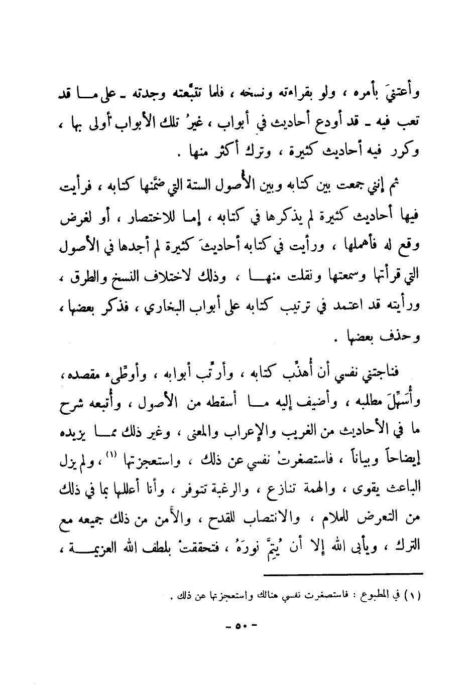 ثم إنني جمعت بين كتابه وبين الأصول الستة التي ضمنها كتابه، فرأيت فيها أحاديث كثيرة لم يذكرها في كتابه، إما للاختصار، أو لغرض وقع له فأهملها، ورأيت في كتابه أحاديث كثيرة لم أجدها في الأصول التي قرأتها وسمعتها ونقلت منها، وذلك لاختلاف النسخ والطرق، ورأيته قد اعتمد في ترتيب كتابه على أبواب البخاري، فذكر بعضها، وحذف بعضها.