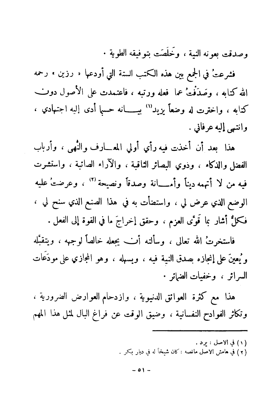 وصدقت بعونه النية، وخلصت بتوفيقه الطوية. فشرعت في الجمع بين هذه الكتب الستة التي أودعها «رزين» -رحمه الله - كتابه، وصَدَفْتُ عما فعله ورتبه، فاعتمدت على الأصول دون كتابه، واخترت له وضعاً يزيد (¬1) ، بيانه حسبما أدى إليه اجتهادي وانتهى إليه عرفاني.
