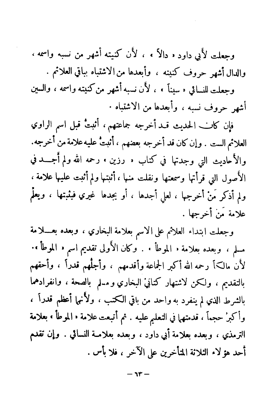 ثم أتبعت علامة «الموطأ» بعلامة الترمذي، وبعده بعلامة أبي داود، وبعده بعلامة النسائي. وإن تقدم أحد هؤلاء الثلاثة المتأخرين على الآخر، فلا بأس.