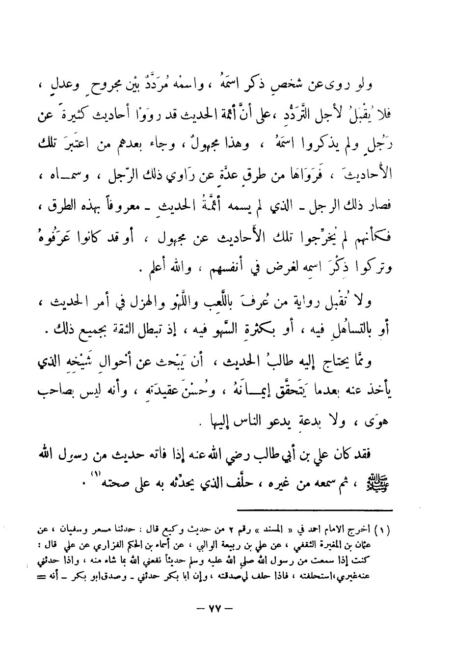 (¬1) أخرج الإمام أحمد في " المسند " رقم 2 من حديث وكيع قال: حدثنا مسعر وسفيان، عن عثمان بن المغيرة الثقفي، عن علي بن ربيعة الوالبي، عن أسماء بن الحكم الفزاري عن علي قال: كنت إذا سمعت من رسول الله صلى الله عليه وسلم حديثاً نفعني الله بما شاء منه، وإذا حدثني عنه غيري، استحلفته، فإذا حلف لي صدقته، وإن أبا بكر حدثني – وصدق أبو بكر – أنه -[78]- سمع النبي صلى الله عليه وسلم قال: " ما من رجل يذنب ذنباً فيتوضأ فيحسن الوضوء " قال مسعر: " ويصلي "، وقال سفيان: " ثم يصلي ركعتين، فيستغفر الله عز وجل إلا غفر له " وإسناده قوي، وصححه ابن خزيمة، وقال الحافظ ابن حجر في " التهذيب " 1/267، 268 بعد كلام طويل: هذا الحديث جيد الإسناد.