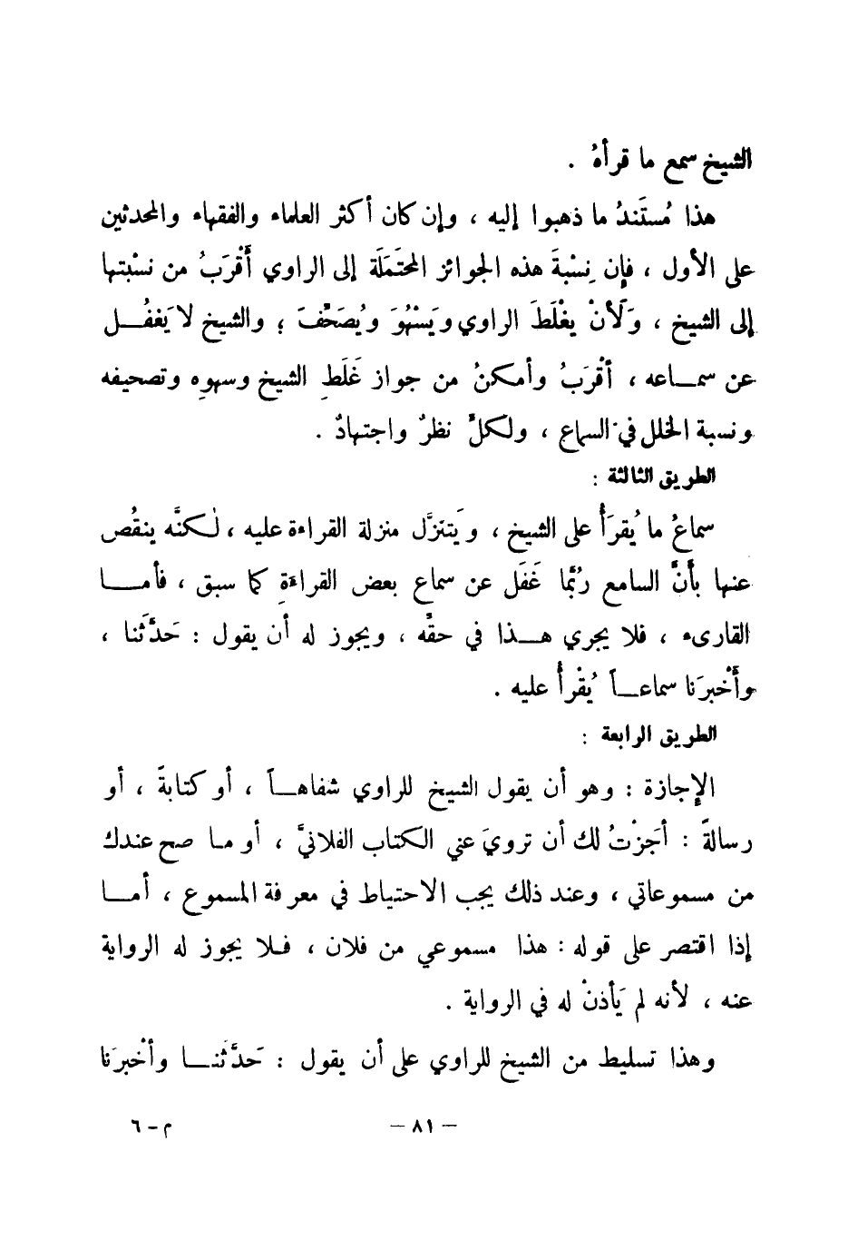 الإجازة: وهو أن يقول الشيخ للراوي شفاهاً، أو كتابة، أو رسالة: أجزت لك أن تروي عني الكتاب الفلاني، أو ما صح عندك من مسموعاتي، وعند ذلك