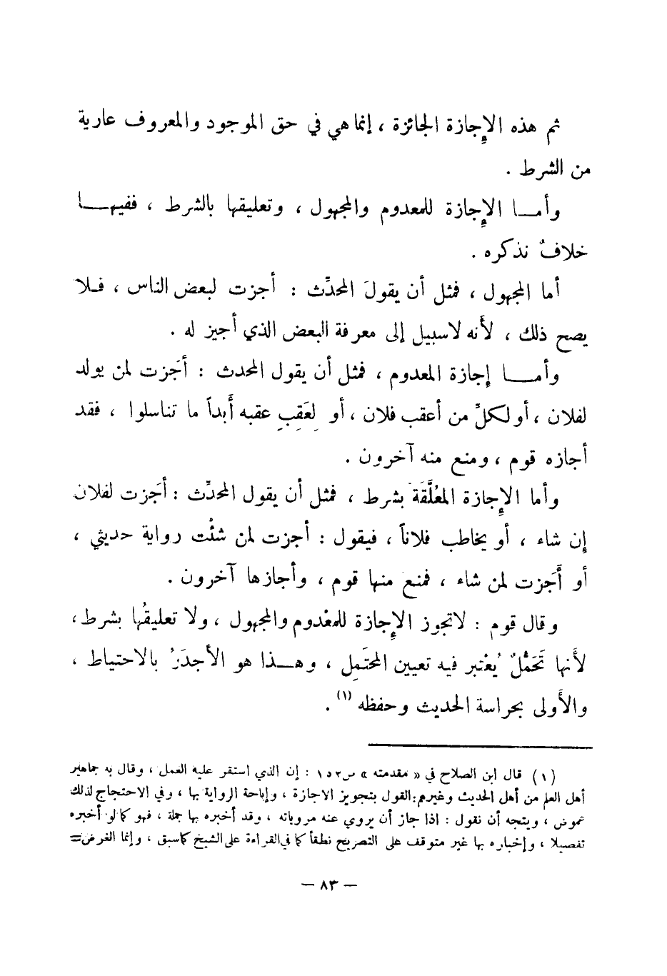 وقال قوم: لا تجوز الإجازة للمعدوم والمجهول، ولا تعليقها بشرط، لأنها تحمُّلٌ يعتبر فيه تعيين المحتمل، وهذا الأجدر بالاحتياط، والأولى بحراسه الحديث وحفظه (¬1) .