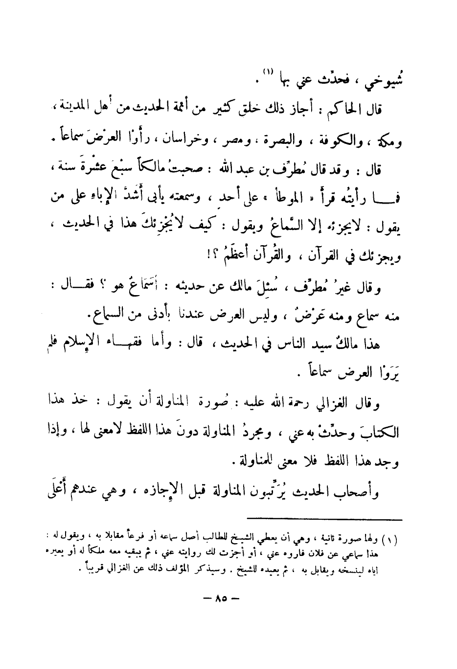 (¬1) ولها صورة ثانية، وهي أن يعطي الشيخ للطالب أصل سماعه أو فرعاً مقابلاً به، ويقول له: هذا سماعي عن فلان فاروه عني، أو أجزت لك روايته عني، ثم يبقيه معه ملكاً له أو يعيره إياه لينسخه ويقابل به، ثم يعيده للشيخ. وسيذكر المؤلف ذلك عن الغزالي قريباً.